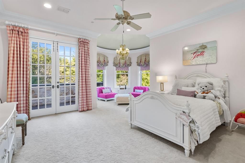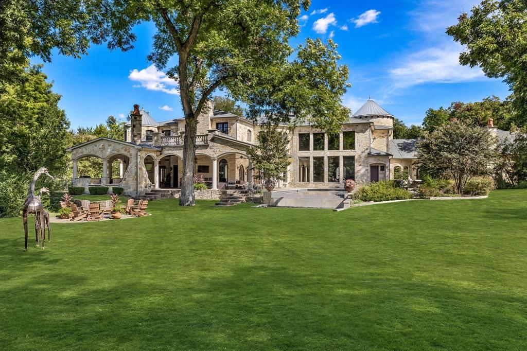 Majestic luxury in cul-de-sac home full of custom features, including private pond & fountain, energy-efficient features, elevator, and custom design touches. Grand entry wows with dramatic iron staircase and vaulted ceilings that show off gold inlay turret with chandelier. Huge dining room with French doors to front veranda, custom ceiling mural, and access to 750-btl temp-controlled wine room. Formal living features floor-to-ceiling UV-protected windows overlooking outdoor retreat, Isokern fireplace, and onyx-topped bar with 2 Uline fridges. Expansive gourmet kitchen includes 2 Bosch dishwashers, Viking 6-burner gas cooktop, double ovens, warming drawer, & massive island. Oversize walk-in pantry offers 2nd built-in fridge and extra storage. Stylish study has French doors to front patio and hidden room used as storm shelter. Primary suite feels like a luxury hotel, with imported wood doors from Bali, coffee bar & refrigerator, and elegant fireplace in sitting area. Spa-like primary bath with exquisite hand-carved marble tub, walk-in shower with dual heads, dual vanities, heated travertine flooring, and walk-in closet with island. Expansive game room offers space for pool table or gaming, with access to large balcony overlooking lush outdoors. Theatre includes ample seating and refrigerator for movie nights. Spacious exercise room fits machines & weights with access to steam shower bathroom. Secondary bedrooms have full baths & walk-in closets, and can be extra office or craft space. Expansive covered patio is ideal outdoor living, with built-in kitchen, fireplace, misting & mosquito systems, and room for seating & dining. Exquisite heated pool overlooks verdant yard with firepit, private pond, and fountain. Additional features include Infinity Carrier HVAC system, gated driveway & sport court, and upstairs 2nd laundry room. Close proximity to top-tier dining, entertainment, and golf courses. Conveniently located to Dallas' top private and collegiate prep schools.