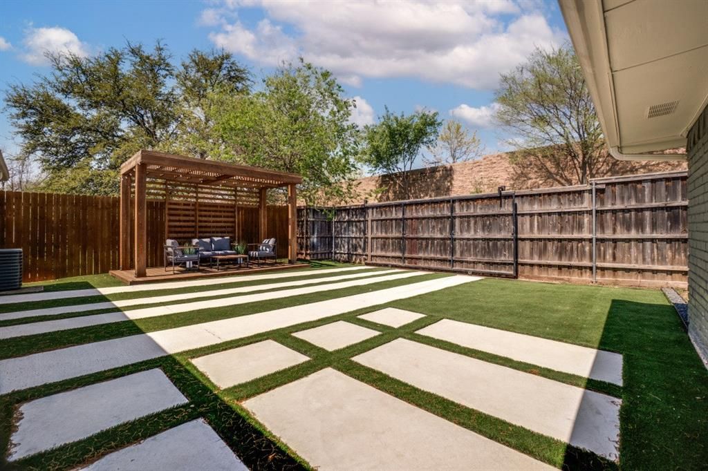 Welcome to your exquisite sanctuary located in one of the most coveted neighborhoods for its proximity to prestigious private schools and the finest attractions Dallas has to offer. This remarkable four-bedroom residence has been masterfully updated, harmoniously blending contemporary luxury with the enchanting allure of mid-century modern design. As you enter this stunning home, you are greeted with striking architectural details and warm, inviting lighting that sets a sophisticated tone. The expansive living area, immersed in natural light, features elegant floors, and distinctive paneling around the fireplace that exudes timeless charm. The kitchen is gorgeous, boasting stainless-steel appliances, and quartz countertops. The open layout flows seamlessly into the dining area, creating an ideal setting. Each of the four bedrooms serves as a peaceful retreat, while one of the bedrooms is privately located in the other wing of the house, which can easily function as a guest suite. The beautifully remodeled bathrooms are a true highlight, featuring luxurious showers, designer tiles, and modern fixtures that transform daily routines into spa-like experiences. Step outside to discover a private outdoor oasis, perfect for alfresco dining or simply unwinding in the serene surroundings. Surrounded by a private fence, the backyard provides a peaceful atmosphere. With a clean and modern look, artificial grass is soft underfoot, inviting you to walk barefoot and enjoy the feeling of a lush lawn without the maintenance. Above, a stylish pergola offers a sense of shelter and elegance. The space is thoughtfully arranged with comfortable outdoor furniture, including a cozy seating area and table. The rear side yard features a large raised bed with natural grass perfect for planting, and gardening. This home is not just a residence; it's a lifestyle in a quiet community that embodies sophistication and charm. Don't miss the chance to claim this extraordinary property as your own!