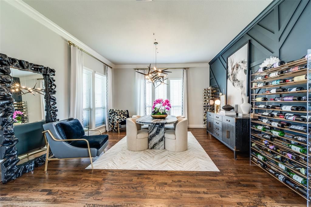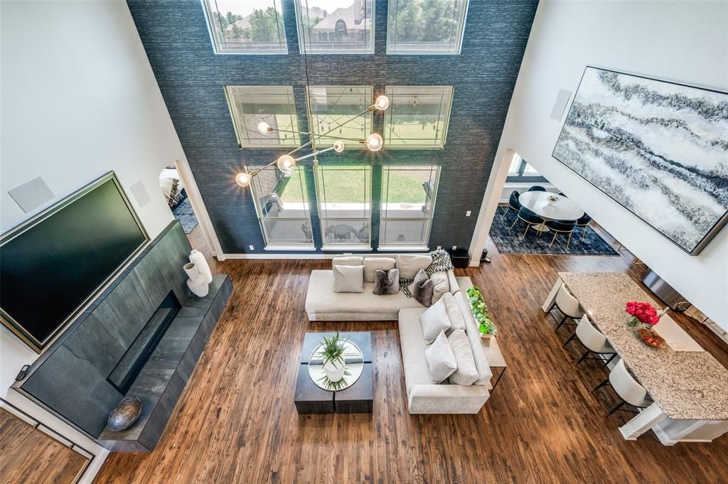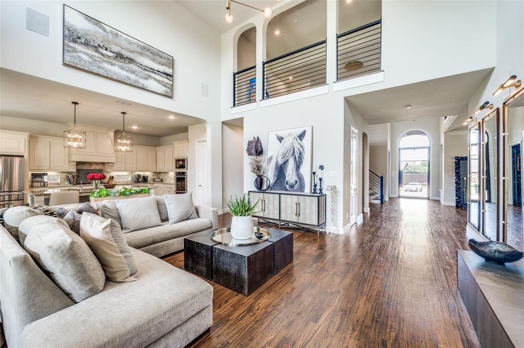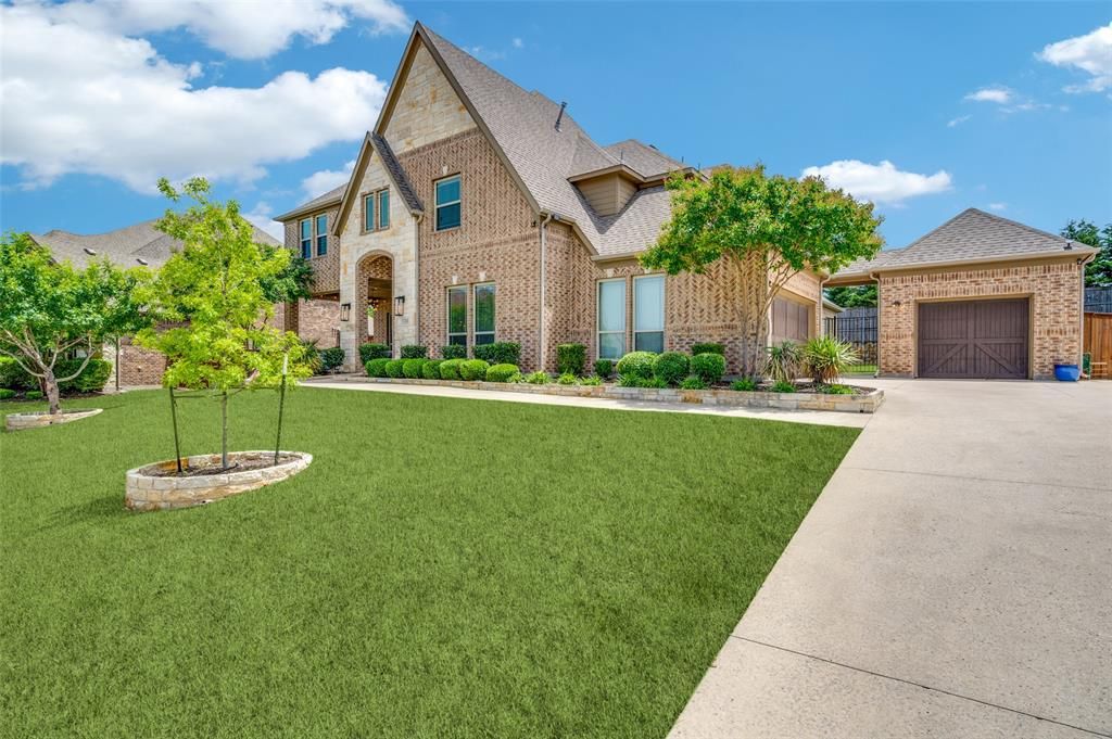 Discover a STUNNING blend of modern luxury and timeless elegance in this exquisite 4-bedroom residence located in the prestigious estate section of the sought-after Lakes of La Cima neighborhood. This home, never before leased, boasts beautiful interior design finishes, handscraped hardwood flooring throughout the 1st floor, a sweeping modern iron staircase, and offers an expansive & inviting open layout. The soaring ceilings of the living room create an impressive sense of space, seamlessly flowing into the spacious kitchen, with large island, and the circular-style adjacent breakfast room. The home has an abundance of natural light with floor-to-ceiling main area windows. Gorgeous chandeliers and custom wallpapered ceilings add opulence and charm to the interiors. Entertain elegantly in the front formal dining room. Relax by the stunning modern style fireplace or work from home in the versatile study, which ingeniously features a Murphy bed for adaptable functionality. The primary suite, conveniently located on the main floor, exudes luxury with a gorgeous RH chandelier, wall light sconces, and a large bathroom with two separate vanity areas, tub & large shower. Don't miss the custom-designed closet with ambient lighting! With three additional well-sized bedrooms upstairs, a game room, handsome media room and a loft area overlooking the main living areas, this residence offers ample space for all your needs. The exterior of the home is equally impressive, situated on a vast grassy lot that promises endless opportunities for outdoor activities. A welcoming covered front porch invites leisurely moments, while the unique garage setup provides both a separate 2-car and a 1-car garage, balancing convenience and storage. This home is located within the highly-desired Walnut Grove High School zone. The beautiful La Cima neighborhood offers swimming pools, walking paths and a lovely lake area. Conveniently close to Highway 380 and minutes from the North Dallas Tollway