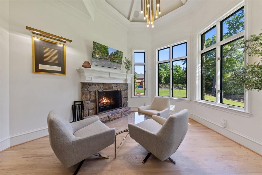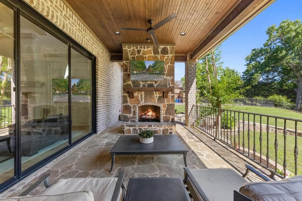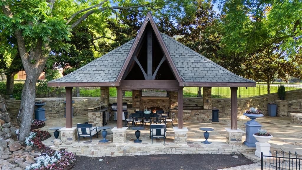 Experience timeless European elegance in this energy-efficient custom manor by Graduate Master Builder Rick McDonald, nestled on over an acre in the prestigious lakefront estate community of Terrabella on Lake Ray Hubbard. Surrounded by majestic oak and pecan trees with serene lake views, this 6,000+ sq ft masterpiece blends old-world charm with modern sophistication. A soaring beamed vaulted ceiling and Juliet balcony crown the grand family room, one of seven fireplaces found throughout the home. The flexible layout includes five spacious bedrooms, five full and two half baths, a private downstairs mother-in-law suite with full bath and its own utility room, a handsome office-library, game room, wet bar, and in-home theatre. The chef's kitchen is both elegant and functional, featuring dual islands, premium appliances, a pot filler, and a walk-in pantry, seamlessly connected to the formal dining area and butler's pantry. A custom wine cellar and built-in safe add to the home's thoughtful amenities. One upstairs bedroom includes a charming loft, perfect as a playroom or study retreat. Outback takes you to a breathtaking covered outdoor living pavilion with fireplace, built-in grill, and dining space, framed by professional landscaping and a dramatic rock waterfall and river feature that creates a peaceful, resort-like setting. Additional highlights include a Porte Cochere, oversized utility room, European chimney pots, abundant storage, prewired sound system, and extensive millwork and custom cabinetry throughout. The primary suite offers a fireplace, spa-inspired bath, and a generous walk-in closet with custom shelving. Multiple zones of HVAC ensure year-round comfort, and energy-efficient construction provides lasting value. This exceptional home offers a rare blend of elegance, comfort, and inspired design just moments from Lake Ray Hubbard.