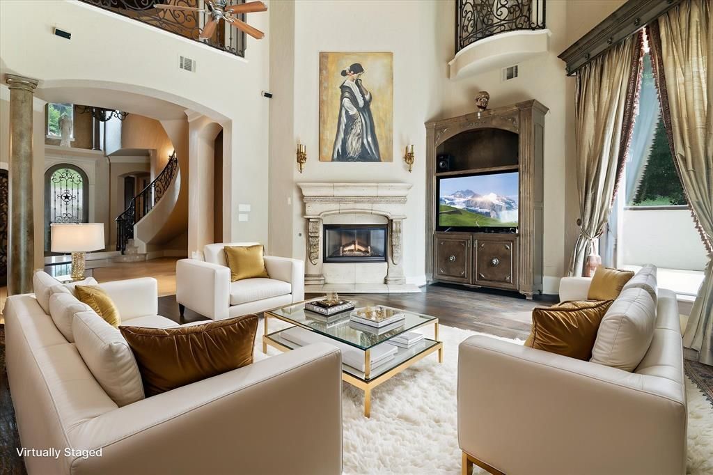 Exuding timeless elegance, this beautifully crafted Tuscan-inspired villa spares no detail in the gated Rivercrest Landing community. From the impeccable curb appeal to the grand entry with a sweeping staircase, detailed woodwork, and custom built-ins, every inch reflects luxury. Soaring vaulted ceilings and ornamental crown molding frame the home's generous living spaces, including six spacious en-suites"”ideal for multi-generational living. The chef's gourmet kitchen features high-end appliances: a 5-burner gas cook top with grill and griddle, warming drawer, double ovens, and a hammered copper farmhouse sink. Rich cabinetry, an oversized island, and a walk-in pantry enhance both functionality and style. Entertain in the formal dining room with coffered ceilings or the dramatic great room showcasing 32-foot ceilings, floor-to-ceiling windows, and a lavish fireplace. The grand master suite includes an inviting sitting area, Juliet balcony overlooking the great room, and a spa-like bath with dual vanities, a stone walk-in shower, and an expansive custom walk-in closet with tailored storage. Additional highlights include a game room with pool views, media room with kitchenette, stately library with built-ins, wine cellar, and laundry rooms on both floors for convenience. A private living quarters with separate entrance provides exceptional flexibility for guests or extended family. Outdoors, enjoy a resort-style covered patio with gas fireplace, sparkling pool, spa, and a tranquil fountain feature surrounded by lush landscaping. The 4-car garage and 2-car carport seamlessly integrate in to the architectural aesthetic of the home. With secure access to scenic Trinity Trails, this home is a rare blend of craftsmanship, comfort, and sophistication in one of Fort Worth's most exclusive enclaves.