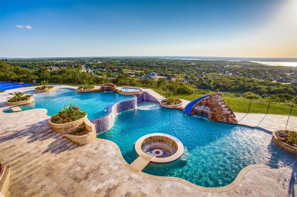 A once in a lifetime opportunity to own an elegantly intimate masterpiece sitting atop one of the highest points for hundreds of miles, with panoramic views! Spectacular views of the lake, Fort Worth, Las Colinas, AT&T Stadium! Designed for a luxurious lifestyle, the magnificent mansion features 8 bedrooms, 8.2 baths, 3 floating staircases, a resort style pool featuring two grottos, waterfalls and water features, a sunken fire pit, fire sconces, and a cabana with outdoor kitchen & bath. The gourmet kitchen has Wolf & SubZero appliances, quartz counters, custom wood ceilings including a wine room, & butlers pantry. The primary suite retreat features spa inspired bath!