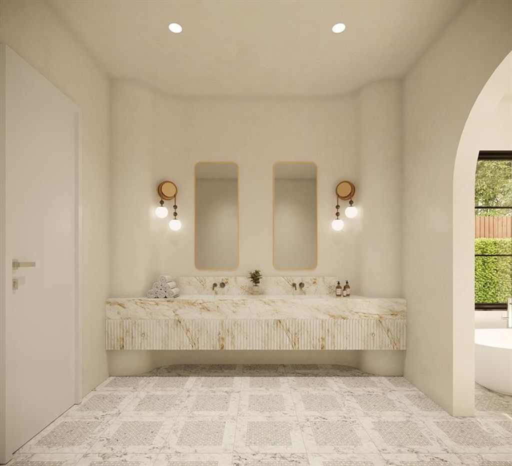 Designed and built by M&E Development, 6823 Norway is a masterclass in modern elegance and architectural charm located in the heart of Preston Hollow. With its striking limestone facade, soaring arched entry, and thoughtful symmetry, this custom new construction blends transitional European inspiration with resort-style comfort. Inside, a dramatic two-story foyer with checkerboard marble flooring and sweeping staircase sets the tone for what's to come. The heart of the home opens to a light-filled living room with vaulted wood-beamed ceilings and a floor-to-ceiling plaster fireplace, seamlessly flowing into a designer kitchen, scullery, and wine room. A striking butler's pantry features integrated refrigeration, stone slab counters, and brass-accented millwork. The primary suite is a true retreat, privately situated with direct pool views, an oversized marble bathroom, and a custom walk-in closet. A downstairs flex room with full bath provides an optional guest suite or home gym. Upstairs, four spacious bedrooms with en-suite baths, a dedicated study nook, and a large playroom offer both flexibility and function. Outdoors, the covered loggia, arched patio, and summer kitchen overlook the pool, creating an idyllic setting for entertaining. Two garages including a porte-cochère, a private motor court, and gated entry offer both elegance and practicality.