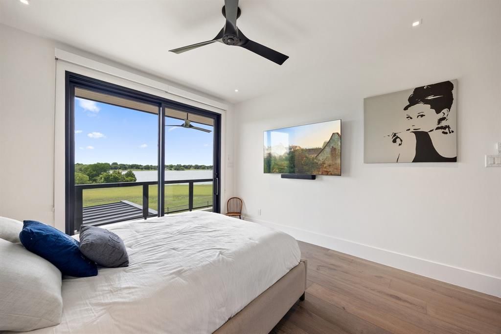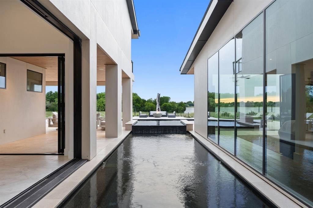This extraordinary lakefront estate sits on a quiet street of just 13 custom homes in Frisco's most private gated community. Perfectly positioned on Lake Lewisville, it offers unobstructed water views preserved by protected land, ensuring your sunsets stay breathtaking. Inside, architectural sophistication meets cutting-edge technology, from carbon-steel panoramic doors to a fully integrated smart home system. A dramatic pivot steel front door opens to soaring ceilings, custom steel-and-wood staircase, and a living room with a ventless gas fireplace and 180-bottle wine wall, seamlessly flowing through pocket glass doors to the resort-style backyard. The chef's kitchen features Sub-Zero and Wolf appliances, a 60" dual fuel range with dual griddles, waterfall quartz island, built-in coffee system, and butler's pantry. The adjacent bar offers a Sub-Zero wine fridge, Scotsman ice maker, and floating LED lit shelves. The primary suite with accordion doors opens to the backyard paradise and connects directly to a fitness center and a covered yoga patio. Tom Ford inspired closets and a spa bath with steam shower, outdoor shower, and smart features complete the retreat. Additional highlights include a downstairs guest suite with patio lake views, a glass-walled executive office overlooking the 4-car showcase garage that is ideal for car collectors, secure safe room, game room with wet bar, home theater, and three ensuite bedrooms upstairs with balcony access. A huge motor court leads to five indoor parking spaces, including a four car garage with epoxy floors, EV charging, and a car wash detail station and a single car garage with a dog wash station. Outdoors, enjoy a Claffey Pools oasis with a luxury pool with spa, Wolf outdoor kitchen, a gas fire bowl, and travertine decking. With Sonos audio, security cameras, blackout shades, and whole-home water filtration, this home is the ultimate blend of elegance, innovation, and lakeside living.