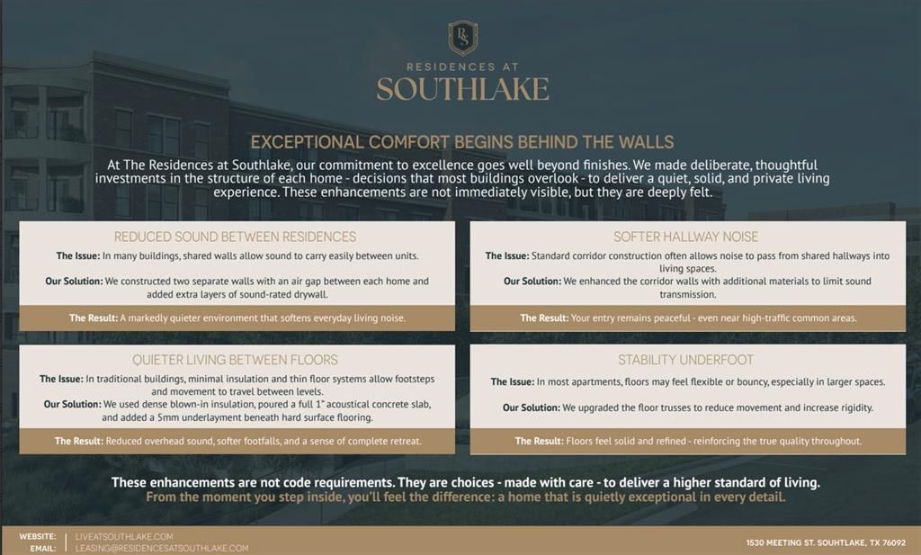 The Residences at Southlake, an exclusive collection of 55 luxury lease homes nestled in the heart of Southlake Town Square. This premier lock andleave community offers an unmatched combination of elegance, convenience, and walkability"”just steps from the city's top-rated restaurants, boutique shopping, wellness studios, and entertainment.These thoughtfully designed 2 and 3 bedroom residences, including penthouse options with flex rooms or available fourth bedrooms, range from approximately 1,700 to 3,000+ square feet. Every home features open-concept living with high-end finishes, sophisticated materials, and modern smart-home touches. Gourmet kitchens with Wolf gas ranges, Thermador appliances, and waterfall-edge Calcutta Valentin quartz countertops Custom soft-close cabinetry, designer lighting, and USB-integrated outlets Spa-inspired bathrooms with upgraded porcelain tilework, freestanding tubs, and luxury fixtures Expansive closets with built-in hampers and electronic roller shades. Smart thermostats and elevated ceiling heights for an open, airy feel, this Unit has Chrome finish hardware and color scheme, herringbone hardwood flooring, electronic front door locks, Patio, Unrivaled Amenities Rooftop sky lounge with indoor outdoor dining, wine lockers, and private event space Full Technogym fitness center, cold plunge, sauna, and spa lounge Private coworking spaces with conference rooms and quiet zones Pet spa, Electric vehicle charging, and secure underground parking with direct access to residences Concierge services are 24 7 and secure entry for ultimate peace of mind This is true walkable luxury living. Enjoy direct access to upscale shops, fine dining and Trader Joe's, Starbucks, and Lululemon. Parks, salons, fitness studios, and entertainment venues are all just steps from your front door. Minutes from DFW International Airport, major highways, and part of the coveted Carroll ISD, these residences offer the ideal blend of luxury and community.