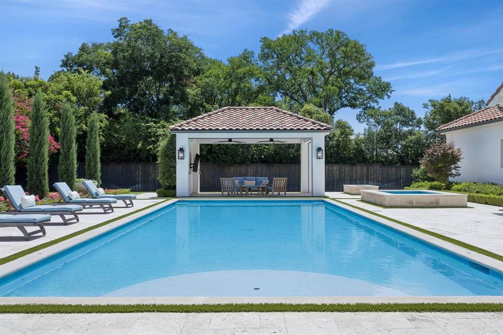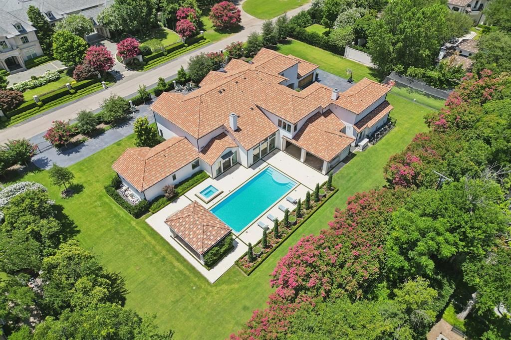 Situated on a beautifully landscaped and fully gated 1.12 acre lot in the heart of Old Preston Hollow, this Spanish inspired Mediterranean estate offers a rare combination of luxury, privacy, and modern convenience in one of the most sought-after neighborhoods in Dallas. Built in 2019, this transitional style home is perfectly suited for family living and entertaining with six bedrooms, multiple living spaces, and incredible outdoor entertaining. The main floor features formal dining, a dedicated office, wet bar with temperature controlled wine room, and a spacious family room with nine-foot windows offering sweeping views of the beautifully landscaped private yard. The primary suite with French doors opening to pool and spa as well as a guest suite are also on the first floor. The gourmet kitchen is a chef's dream, complete with a Sub-Zero fridge and freezer, a Wolf range with double ovens, multiple dishwashers, and a large island perfect for gathering. An additional living room is downstairs that opens to covered patio and creates a seamless space for indoor and outdoor entertaining. Upstairs features four additional ensuite bedrooms, a media room, game room with kitchenette, and home gym with sauna.Outside, the exquisite landscaped yard provides a tranquil retreat with a pool, spa, fire pit, and cabana designed by Pool Environments. The covered patio is perfect for grilling and dining outdoors, equipped with phantom screens and heaters so you can enjoy it year-round. The beautifully landscaped yard provides plenty of additional space for fun and even a pickle ball court if desired. A four-car garage with a private motor court adds to the property's exclusivity. Don't miss this unparalleled opportunity to live luxuriously and privately in one of Dallas' most prestigious neighborhoods.