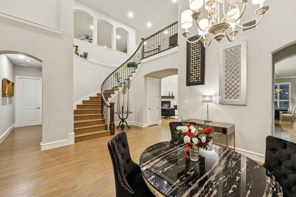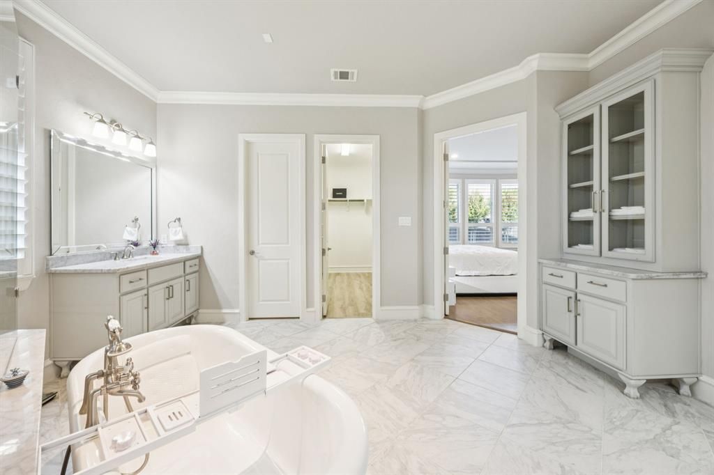Stunning FULLY MODERN FURNISHED Home in Carillon, Southlake's premier master-planned community, known for its picturesque lakes and resort-style amenities. Ideally located near top-rated schools, dining, and shopping. This designer-inspired 5 bedroom, 5 bathroom residence with 2 powder rooms offers refined living on an oversized corner lot. Every bedroom features its own ensuite bath, ensuring privacy and comfort throughout. The home is filled with natural light, enhanced by wood floors and thoughtful designer touches at every turn. The open layout includes a gas fireplace in the living room, a dedicated office, elegant formal dining with soaring double-height ceilings, and a breakfast area off the kitchen. Upstairs, the game room with bar area and media room provide ideal spaces for entertaining and relaxation. The expansive primary suite is a true retreat with wall-to-wall windows and shutters, a spa-like bathroom, and two oversized walk-in closets. For seamless indoor-outdoor living, sliding doors disappear into the wall, opening to a generous covered patio. A split garage adds both convenience and functionality. Carillon offers a resort-style lifestyle with three lakes, a sparkling pool with pavilion, sport courts, picnic areas, playground, and miles of scenic trails.