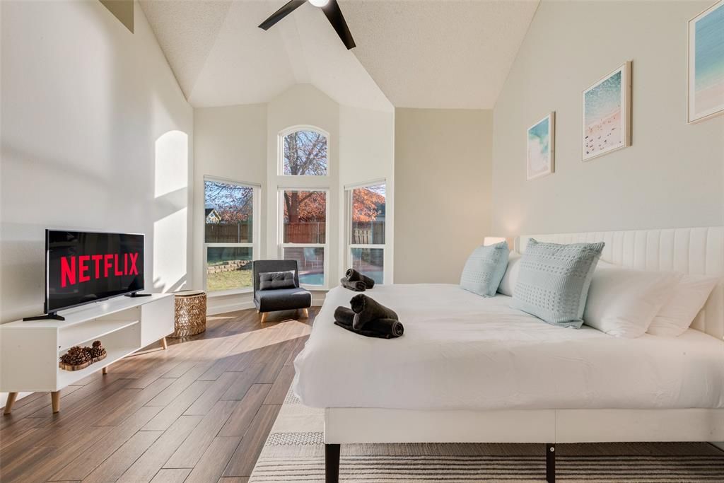 Charming pool home in the heart of North Richlandhills. Upon entering, the living room greets you with abundant natural light and big windows that overlooks the stunning pool area. The kitchen is a true highlight with modern appliances, ample counter space, and all the essentials you need to prepare everything from home-cooked meals to quick snacks with ease. Bedrooms are thoughtfully designed as personal retreats, complete with soft linens and elegant touches, while the bathrooms feature clean finishes and fresh amenities. Entertainment is endless, with a private cinema room, arcade games, foosball, and a pool table, creating unforgettable moments for guests of all ages. Step outside into the backyard to find a sparkling swimming pool, relaxing hot tub, and outdoor grill, perfect for both play and leisure. Fitness enthusiasts can take advantage of the fully stocked gym, while convenient amenities like high-speed Wi-Fi, washer and dryer. Beyond the property, the neighborhood is a true gem, with nearby parks, walking trails and green spaces, boutique stores, cafés and restaurants. From the moment you arrive, you'll appreciate the peaceful tree-lined streets and welcoming community feel, all while being just minutes from shopping centers, entertainment, and major highways.