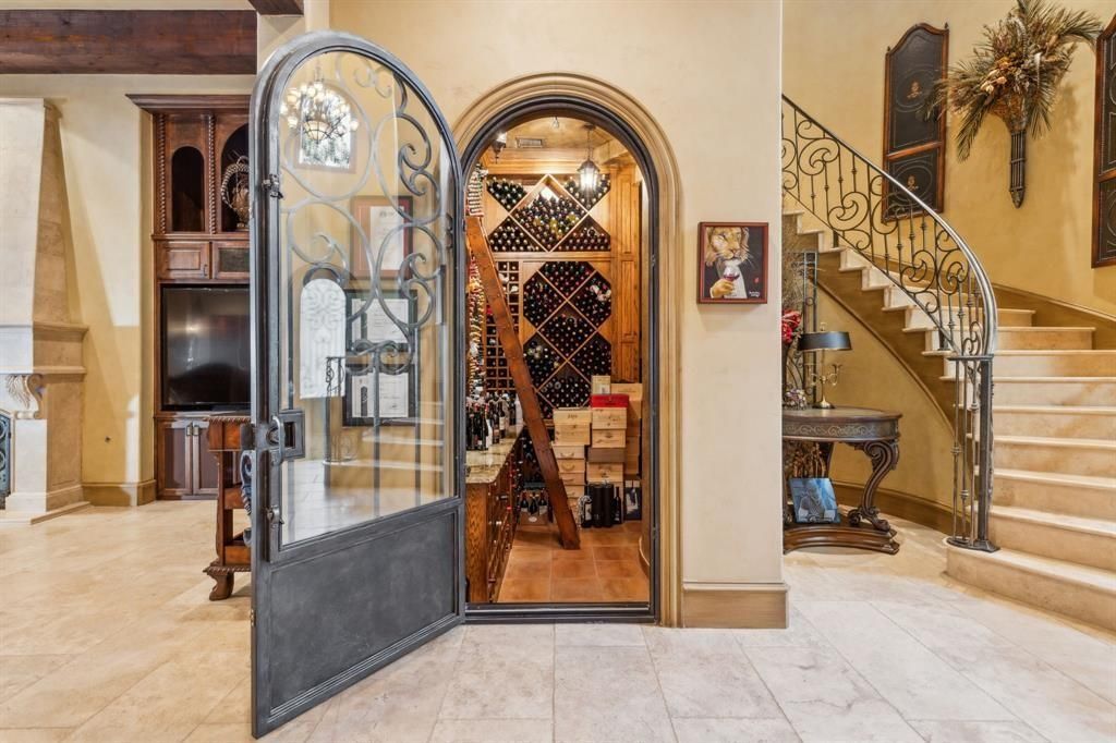 Step into this extraordinary home A grand stone staircase with wrought iron railing welcomes you, set against floors of Turkish travertine. Exposed firewood beams painstakingly stained to perfection. The quality is so extraordinary that two cranes broke during installation. Throughout the home, hand-scraped oak floors, multiple marble fireplaces crowned with elegant molding, and plantation shutters elevate every space. The living room boasts gorgeous iron French doors that open to a sprawling outdoor patio, seamlessly blending indoor and outdoor living. The oversized kitchen is a chef's dream, featuring a massive granite island with oval seating for six, custom maple cabinetry, and top-of-the-line appliances. For entertainment, enjoy a massive media room complete with billiards, home theatre, and a commercial-grade pub with stainless steel finishes. The library-sized study is wrapped in rich maple wood paneling, with soaring ceilings, plantation shutters, and semi-circular windows that flood the room with natural light. Stay fit in the exercise room, equipped with 4,500 lbs of professional-grade equipment. Wine enthusiasts will love the climate controlled wine cellar, capable of holding 3,000 bottles. The primary suite is a retreat in itself with a custom iron chandelier, breathtaking backyard views, and a spa like bathroom featuring diamond pattern granite floors, double sinks, an oversized shower with three body sprays, plus a urinal and bidet. The master closet boasts a soaring ceiling and a hidden passageway leading to the library. Step outside to your resort-style patio, with an in-ground spa, towering 15-foot privacy fence, built-in grill, outdoor fireplace, oversized TV, double ceiling fans, and dining area "” all watched over by two majestic custom stone lions. This home is truly one-of-a-kind, offering a blend of artistry, function, and luxury that must be seen to be believed.
