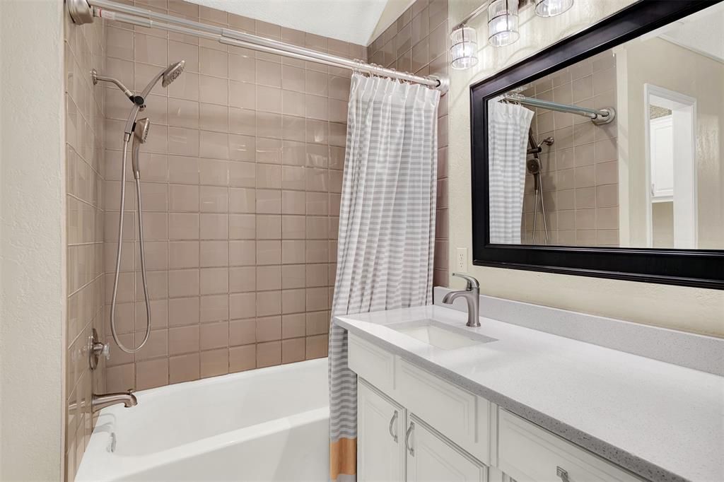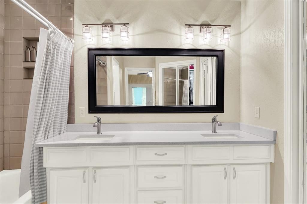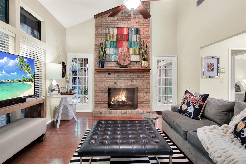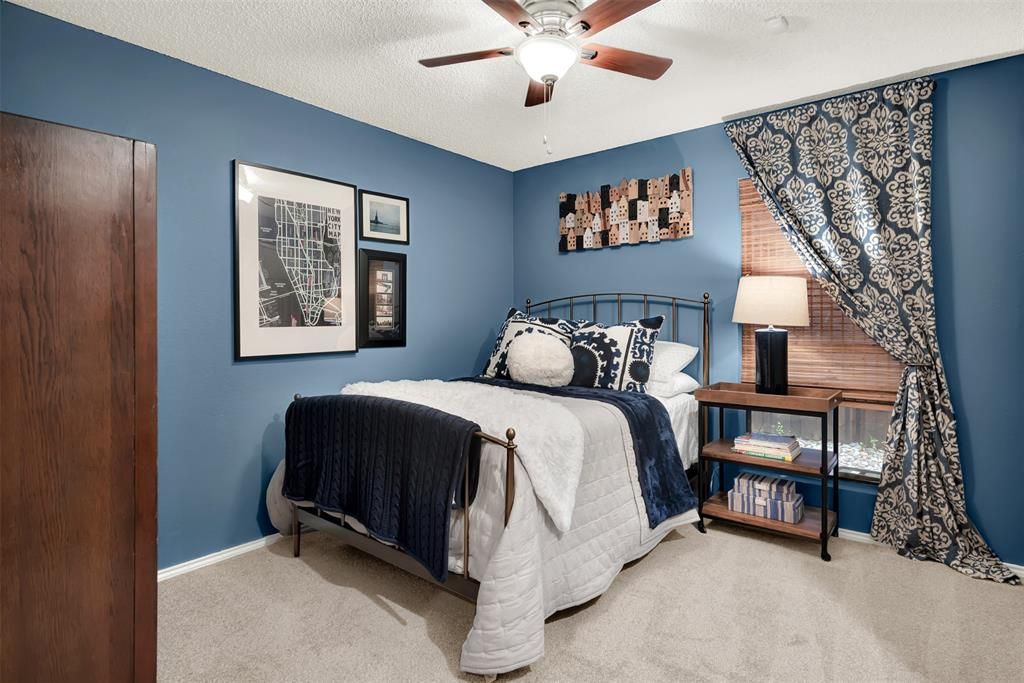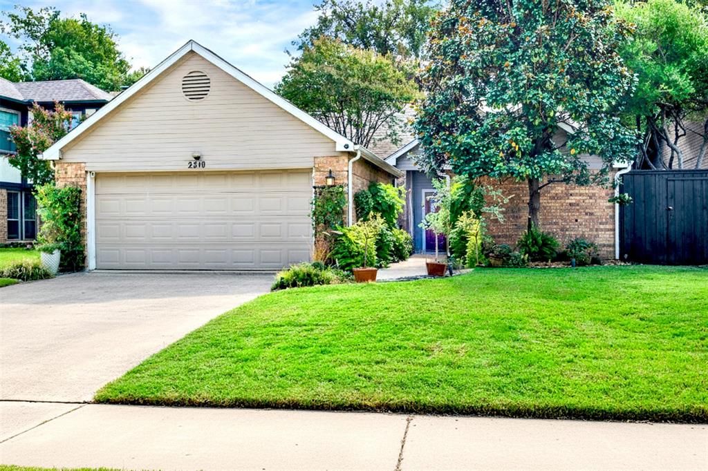 This immaculate 2-bedroom, 2-bathroom home highlights modern design and thoughtful details. The kitchen features stainless steel appliances and a gas stove. In the living and dining area, hardwood floors add warmth, while a vaulted ceiling, gas log fireplace, and a wall of windows create an inviting, light-filled space (current solar screens can be removed and replaced with original screens). The primary bedroom includes a reading nook and French doors that open to a covered patio, extending the living area outdoors. The front yard is attractively landscaped and maintained by the HOA, while the fenced side and rear yards proved additional privacy and outdoor enjoyment with a covered patio. Nearby, the community offers a duck pond with a fountain and a walking trail for relaxation and recreation. Established neighborhood, mature trees, and outstanding location -- quick access to PGBT, DNT & I-35, local shops & dining. Act now!