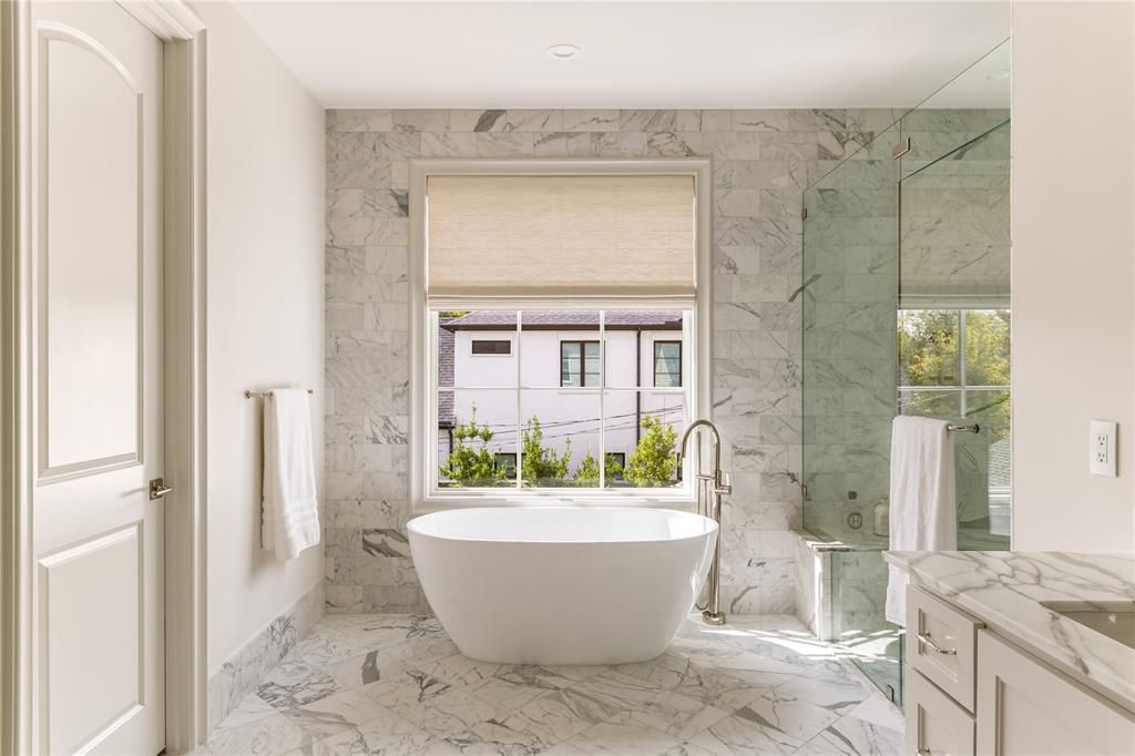 This elegant 5,659 sq ft new construction by Prous Homes offers timeless design and exceptional craftsmanship in the heart of Highland Park. Ideally located just a short walk from Bradfield Elementary, Highland Park Village, and the Dallas Country Club, the home features 5 bedrooms, all ensuite, along with 6 full baths and one half bath. Inside, the chef's kitchen is outfitted with a 48" Sub-Zero refrigerator and freezer, Wolf appliances, Taj Mahal Quartzite countertops, and a spacious walk-in pantry. A stylish bar and lounge area with a Sub-Zero wine fridge and ice maker connects the study or formal living space to the warm and inviting family room, which showcases a hand-carved limestone fireplace and wood beam accents. The living room features a striking black marble fireplace and grasscloth wall covering, adding texture and elegance. The main level also includes a mudroom off the garage and an office tucked just off the kitchen. Outdoor living is seamless with a patio and fireplace for year-round enjoyment. White Oak floors run throughout the home, complemented by curated lighting and high-end finishes. The second floor offers four bedrooms, including a luxurious primary suite with an oversized walk-in closet, a large game room, and a generous laundry room. The fifth bedroom is located on the third floor, offering flexibility for guests, a home office, or gym. This beautifully designed home blends sophistication and comfort in one of Dallas's most desirable neighborhoods.