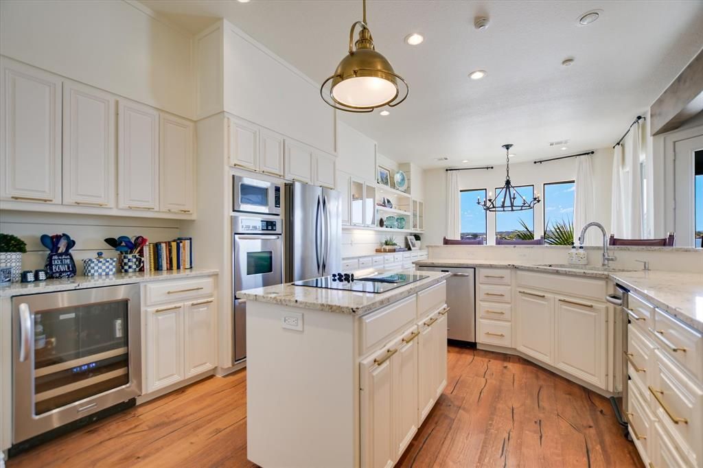 LOCATION LOCATION LOCATION! OPEN WATER ON LAKE LBJ on Iconic Lighthouse Drive. This 5 Bdrm, 5.5 Bath stately home with a rare 3 car garage and parking for up to 11 cars is ideally positioned with North-South exposure. Beautiful open water views from the iron double front doors and massive open water views and direct access to the lake from the back of the house-boat dock-deck. Almost every room in this re-imagined and newly renovated home has a view of Lake LBJ. This home features wide plank engineered hand-scraped wood floors throughout most of the house as well as stone in wet areas and closets, and luxury vinyl flooring in the bunk room and 1bd, 1ba boat house casita. The primary suite features 2 ensuite bathrooms and separate closets and a newly renovated shower. There is a large study off of the entrance and another bonus room off the kitchen & powder room- perfect as another office, hobby room or overflow room for guests. Both bathrooms upstairs have also been renovated with porcelain and quartz. The spacious game room up with wet bar and balcony overlooking lake is shared by two Bdrms, Baths and a bunkroom. There is a newly added turfed area as the side yard, perfect for dogs and ease of cleaning. The outdoor kitchen is off the ovrsz deck is perfect for gatherings, or just enjoying the rays, views, and sunsets. There are 2 hydraulic jet skii lifts and single boat lift. This home is perfect as a full time residence, family lake house, and or a great STR investment opportunity. Come See!