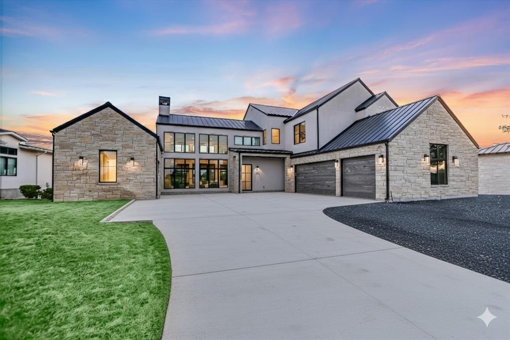 FIRST TIME OFFERED FOR SALE IN HIGHLY DESIRED LEGENDARY ESTATES ON LAKE LBJ. This gorgeous Keith Wing Modern Transitional WATERFRONT custom home is positioned on the Colorado arm of Lake LBJ & sits high & beautifully on .68 ac with stunning views of Packsaddle Mtn., Lookout Mtn, & the entire Hill Country as the backdrop to LAKE LBJ. Having a gorgeous home & pool w- a large gentle sloping backyard featuring a Century Oak that helps shade the private beach & fire pit areas down by the massive boat dock is a unique feature as well. The artfully planned boat dock is two levels & has hydraulic jet ski lift-platforms for 4 jets skis, planned spaces for kayaks, fishing dock, private slide into the lake, & two large hydraulic boat lifts complete w- electric boat garage covers. The upstairs deck is designed for entertaining & or relaxing under the sun & stars, making lasting memories & enjoying views for days! Completed in late 2020, this home of 5,054 sqft is open w- a flexible floorplan w- large rooms, built for family & many friends w-out feeling crowded or compromising privacy. The large metal front door welcomes you into the main LR, DR, Kitchen, & 2nd LR complete w Wet bar & all rooms encompassed with custom black iron windows & collapsible iron doors out back to the upstairs liv. areas & outdoor kitchen w- island. All windows have top tier powered shades & a smart lighting system inside & out. 2 primary suites w- 2 primary baths on the 1st level & upstairs, 3 very large bedrooms w- en-suite baths plus a bunk room w- 4 built-in full-size bunk beds w- an en-suite bathroom. There is a rec room off the bunk room & a large loft game room perfect for pool, ping pong, gaming or even an office-workout room that has auto black out shades that convert the room into another 2 bedroom sized suite. The chef's kitchen has a large pantry & large laundry & mud room off the 3-car garage w- attached commercial W-D for towels & there's a golf simulator too!