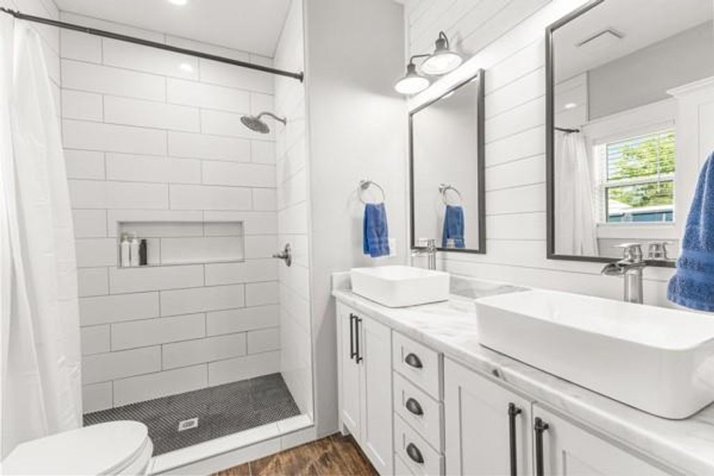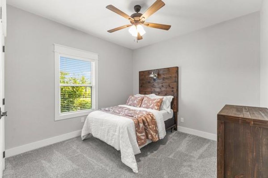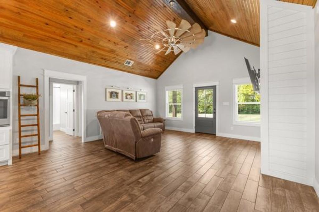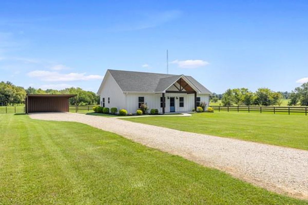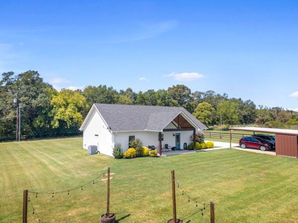 Attractive 3 bedroom, 2 bath home comes with landscaping, Smart Siding, 2-car carport, and a spacious 4 acres! Located on a quiet County Road southeast of Sulphur Springs, enjoy the panaromic views from the vaulted porches. Step inside an impressive entrance with wood-ceilings and vaulted open floor plan. A vent-less gas log fireplace will provide lots of cozy ambience on cold, brisk nights. Bring your recipes to a kitchen with marble countertops, 2 ovens, island with breakfast bar seating, farmhouse sink, tile backsplash, stainless steel appliances, and door to covered back porch. Durable porcelain wood-looking floors presents a beautiful flow throughout the living, dining, laundry room, and bathrooms. The primary bedroom comes with a vaulted ceiling, walk-in closet, double sinks, and a walk-in shower with subway tile. Split from the primary bedroom, the guest bedrooms share a full bathroom with subway tile in the shower. A laundry room and mudroom are located near the back entrance. Additional perks include recessed lights, spray-foam insulation in attic, marble countertops in the bathrooms, ceiling fans, carport storage area, outdoor fire pit, gutters, and French drains. Work from home with HIGH-SPEED INTERNET while relishing this spectacular country setting, only minutes to town!