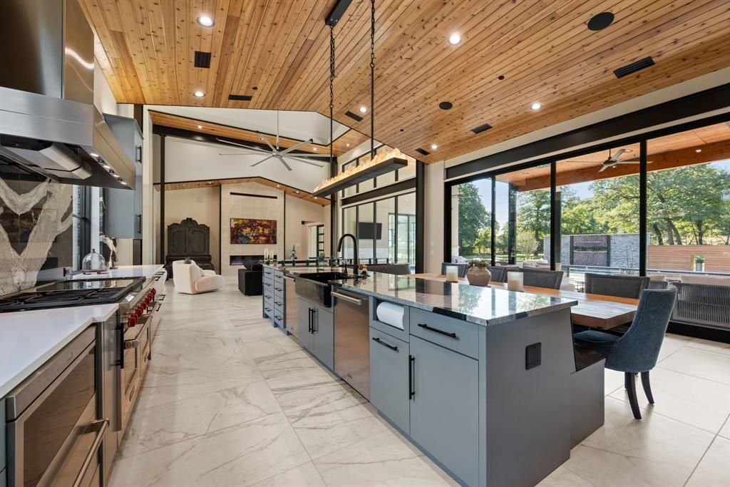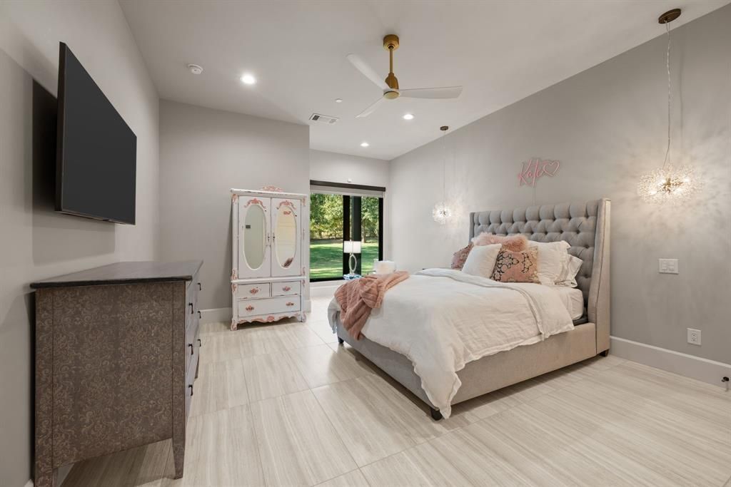 Experience modern luxury on 2 private acres in the prestigious Hat Creek Estates of Bartonville, Texas. This single story architectural masterpiece blends sleek contemporary design with warm natural elements, offering an inviting yet sophisticated retreat behind a gated entrance and circle driveway that leads to a grand entryway. Inside, dramatic ceilings, cedar-paneled accents, and expansive walls of glass create a seamless connection between indoor and outdoor living. The open-concept layout showcases a stone fireplace in the living room and a chef-inspired kitchen featuring a dramatic natural stone island, built-in wine cooler, dual dishwashers, hidden butler's pantry, Sub-Zero refrigerators, Wolf gas range, and wet bar. Accordion glass doors open to the backyard oasis, where resort-style amenities include a sparkling pool, cascading water features, and multiple lounge and dining areas for gatherings. A game room opens directly to the patio area, while the nearby media room offers an ideal space for movie nights or game-day viewing. The luxurious primary suite is a private sanctuary with his-and-her walk-in closets, a spa-like bathroom featuring dual shower heads, separate vanities and an exercise room off the primary bath, with the laundry room conveniently connected to the walk-in closet. Car enthusiasts and adventurers alike will appreciate the impressive 8-car garage with a Tesla charging station and dedicated RV-boat parking. The detached 1,755-square-foot guest house"”located off the RV garage"”includes 2 bedrooms, 2 bathrooms, walk-in closets, its own living and dining area, and a full kitchen, perfect for extended family or guests. Every detail of this home exudes sophistication and comfort, from designer finishes throughout to its thoughtful layout designed for seamless living and entertaining. With its refined craftsmanship, privacy, & resort-style amenities, this estate represents the pinnacle of Bartonville luxury living.
