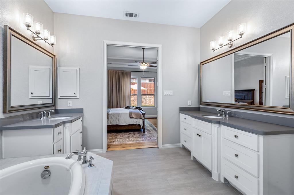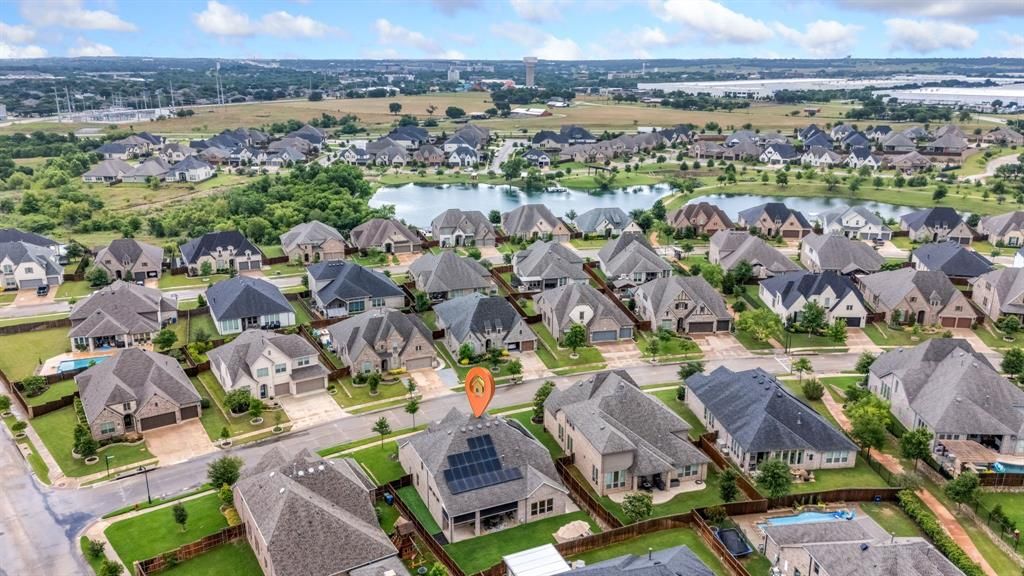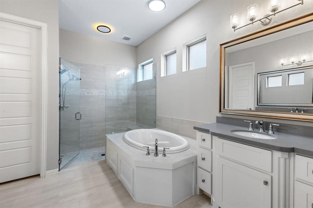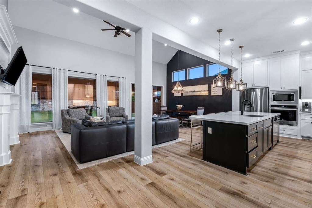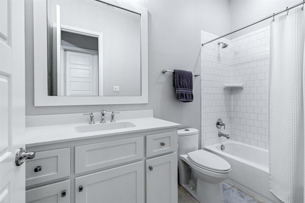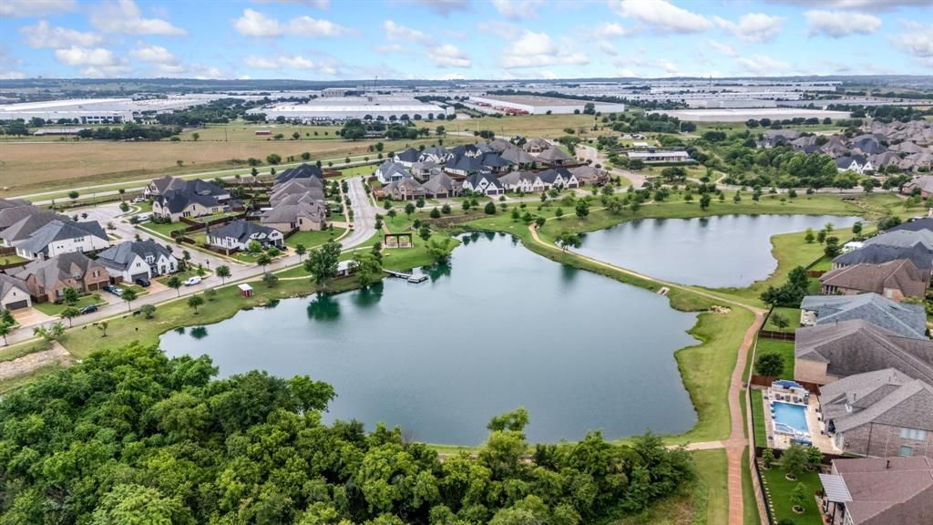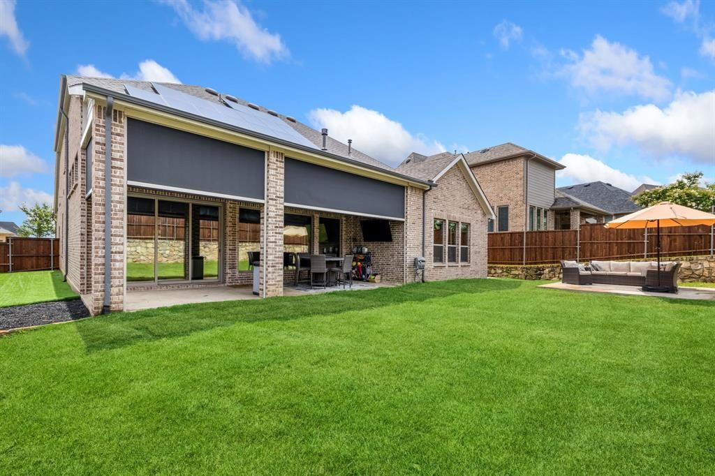 Stunning home nestled in the highly desirable Fairway Ranch community in highly acclaimed Northwest ISD. This immaculate 4 bedroom, 4 full bath home features an open concept floor plan ideal for entertaining with a seamless flow connecting the kitchen to the great room. Natural light fills the main living area which boasts vaulted ceilings, exposed wood beam, designer lighting, LVP flooring, and decorative gas fireplace. The Chef's kitchen showcases a large island with silestone countertops, KitchenAid dishwasher, 5 burner Whirlpool gas cooktop, subway tile backsplash, and walk-in pantry. The primary suite features a garden tub, dual vanities, and oversized shower with frameless enclosure. Two additional bedrooms downstairs including a private guest suite with an ensuite bathroom. Upstairs features a 4th bedroom, game room and media room. Custom upgrades include tinted windows, exterior Jellyfish lighting, and surround sound wiring. Solar panels will keep down your energy bills low! Private backyard with covered patio and motorized shades and a bonus sitting area. Neighborhood features include a resort style pool, multiple playgrounds, fishing pond and walking traiils.