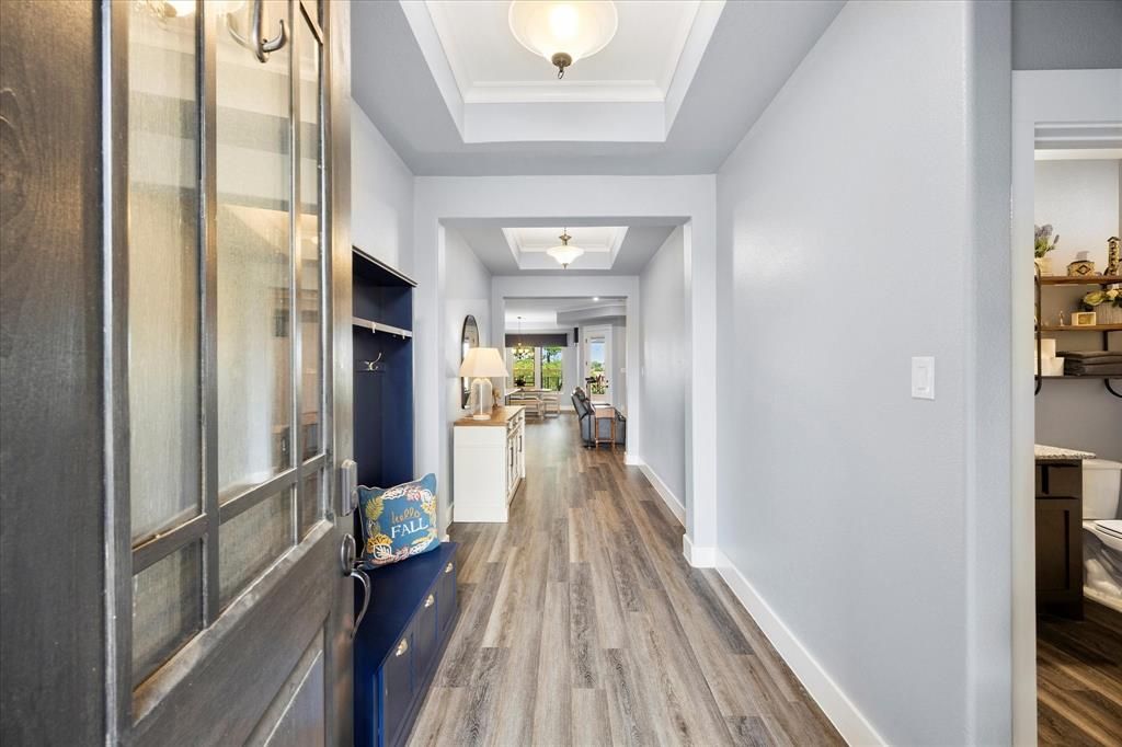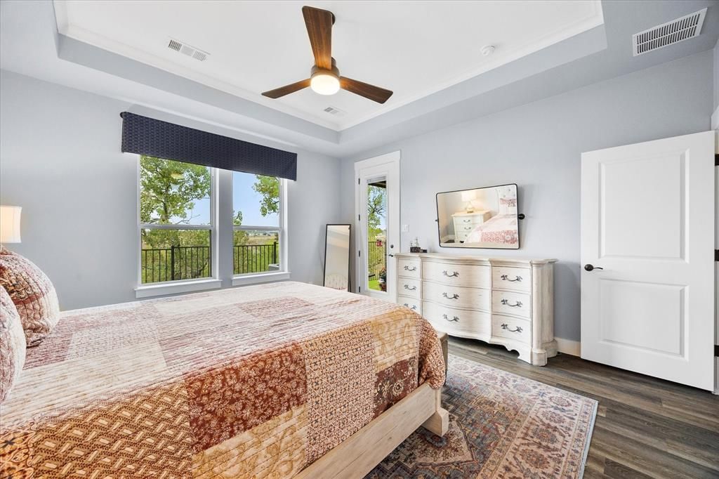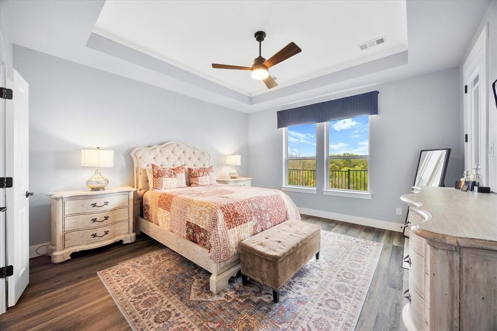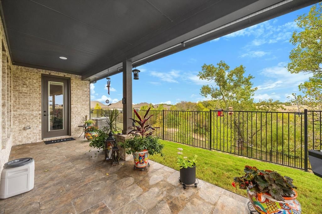 This Rockwall residence delivers a unique oasis feeling plus all the 55+ community amenities. Boasting a panoramic backyard view, extended full covered patio, new paint throughout and a spacious 2-car garage, this home offers a seamless combination of comfort and style. The Premium Lot is strategically placed to provide a panoramic view of the greenbelt while remaining a comfortable distance from the community walking trails. The result is an amazing tranquil and private space that remains uninterrupted from community goings on. The open floor plan is designed to enhance both functionality and luxury, ideal for entertaining or relaxing in comfort You'll enjoy the expanded owners WIC, LVP, Crown molding and new paint throughout. Step outside onto the patio to experience a "treehouse-like feel" as you gaze upon the expansive greenbelt and Green's Lake. Sitting on a hilltop, you're literally looking down upon this lovely space. A perfect setting for entertaining, grilling and just relaxing. The kitchen is a chef's delight, equipped with gleaming granite countertops and an extended island that provides plenty of space for meal preparation and casual dining. Whether you're hosting a dinner party or enjoying a quiet breakfast, this kitchen is designed to cater to all your culinary needs. A private office space presents the perfect solution for those working from home or for creating a serene reading nook. The French doors offer a view of the spectacular backyard. Here, every detail has been thoughtfully considered to create a home that not only meets modern living standards but exceeds them. Experience the tranquil lifestyle you've been dreaming of with this exceptional property.