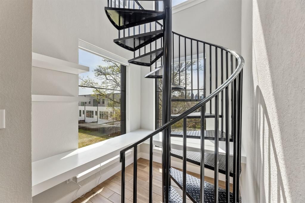 Experience unparalleled luxury and sophistication in this refined modern condominium, nestled beautifully in the vibrant East Village neighborhood. When entering you are welcomed with a first floor bedroom providing you with the opportunity to utilize as an office or a fitness room. Relish a generously sized living area with high ceilings and wide reaching windows that flood the space with natural lighting. The finest craftsmanship with meticulously designed layout that maximizes functionality and comfort. The chef inspired kitchen features floor to ceiling cabinetry, quartz countertops, SS appliances, a pot filler and gas cooktop. The primary suite highlights an ensuite bathroom with walk in closet, Carrera polished tile on the floor and shower walls, a floating vanity and an oversized mirror. Walking up the spiral staircase to the fourth floor you are greeted with a wet bar. Head out to the rooftop deck for entertaining and spectacular views of the downtown Dallas skyline. Schedule a tour today and discover this elevated lifestyle.