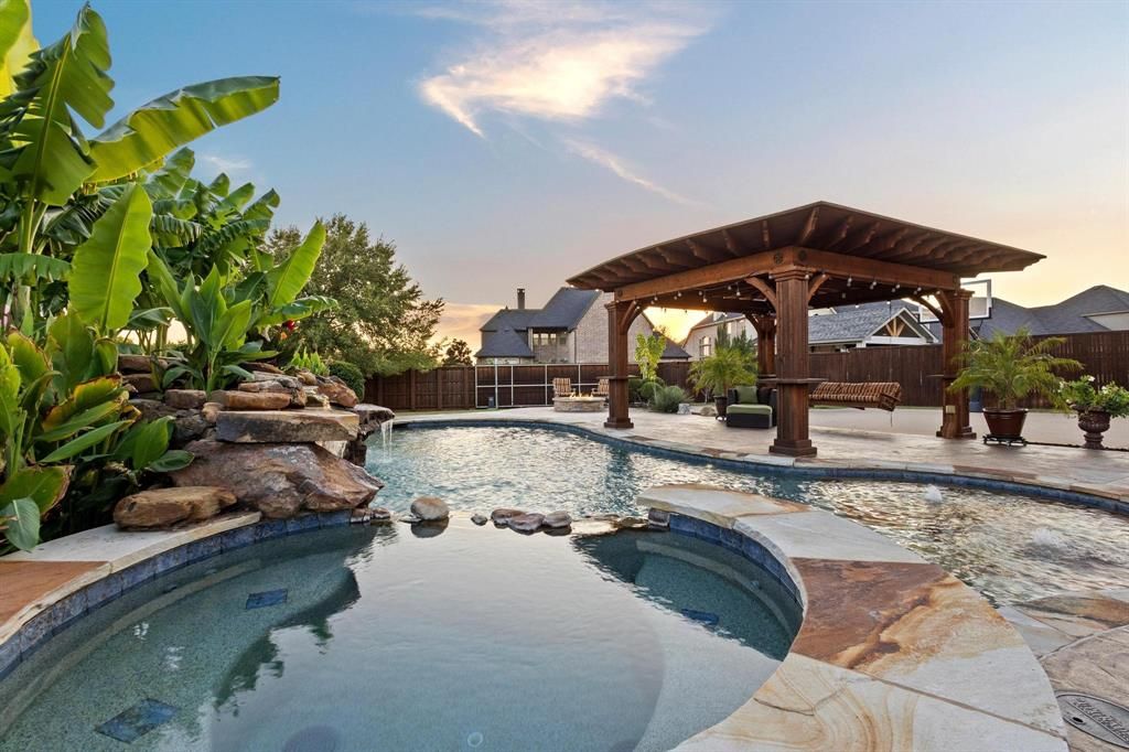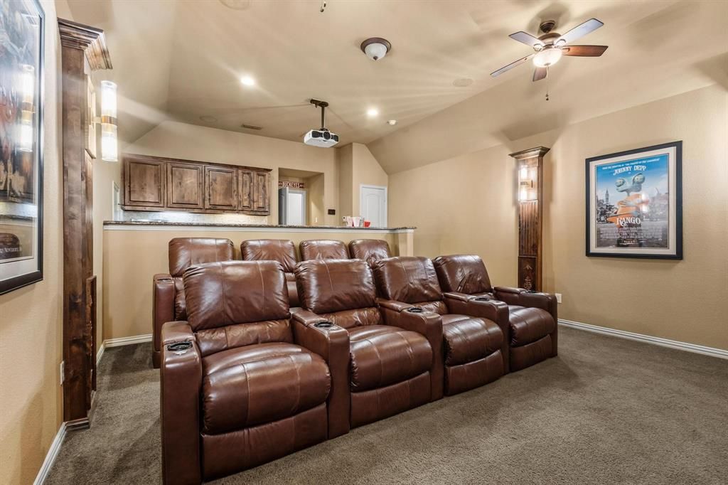 Luxury, technology, and energy efficiency combine in this solar-powered 5-bedroom, 4-bath, 4,693 sq ft home located on a 0.448 acre corner lot in the highly rated Frisco ISD; Pink Elementary, Griffin Middle, and Wakeland High. Adjacent to the Cottonwood Creek Trail system, this property offers the perfect balance of privacy, lifestyle, and convenience. Step inside to discover bright, open living spaces filled with natural light, two private offices, upstairs and down, as well as a massive media room with seating for 13, surround sound, theater seating, and a bar area. Smart-home features include Sonos music zones, Lutron lighting, Gemstone exterior lights, Aqualink pool controls, and Rachio irrigation, all conveniently managed by app. Solid core doors throughout reduce noise and elevate the sense of quality craftsmanship. The resort style backyard features a 28,800 gallon chlorine pool with hot tub, waterfalls, grotto, and multi-color LED lighting. The covered stone patio includes an outdoor kitchen, infrared heaters, fans, mounted TV, and a stone gas fire pit overlooking the pool and pergola for added summer shade. Recent improvements include a new Class 4 impact resistant roof with 50 year warranty for annual insurance discounts, new gutters and downspouts, fresh exterior screens, and newly stained fence, pergola, and patio. Energy efficiency shines with 52 solar panels ensuring low electric costs, twin 5-ton HVAC units that are 3 and 7 years old, and twin 50 gallon water heaters with flow pump. The property is also prioritized on the local hospital power grid. Additional highlights include a new refrigerator and dishwasher, New Age metal garage cabinetry, and an extra-deep 3 car garage with an oversized driveway and an electric gate for rear entry. Every detail has been crafted for comfort, performance, and peace of mind, making it a standout example of modern smart luxury living. $20k Seller Concession. Make your appointment today to see this one of a kind home.