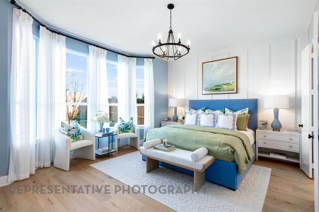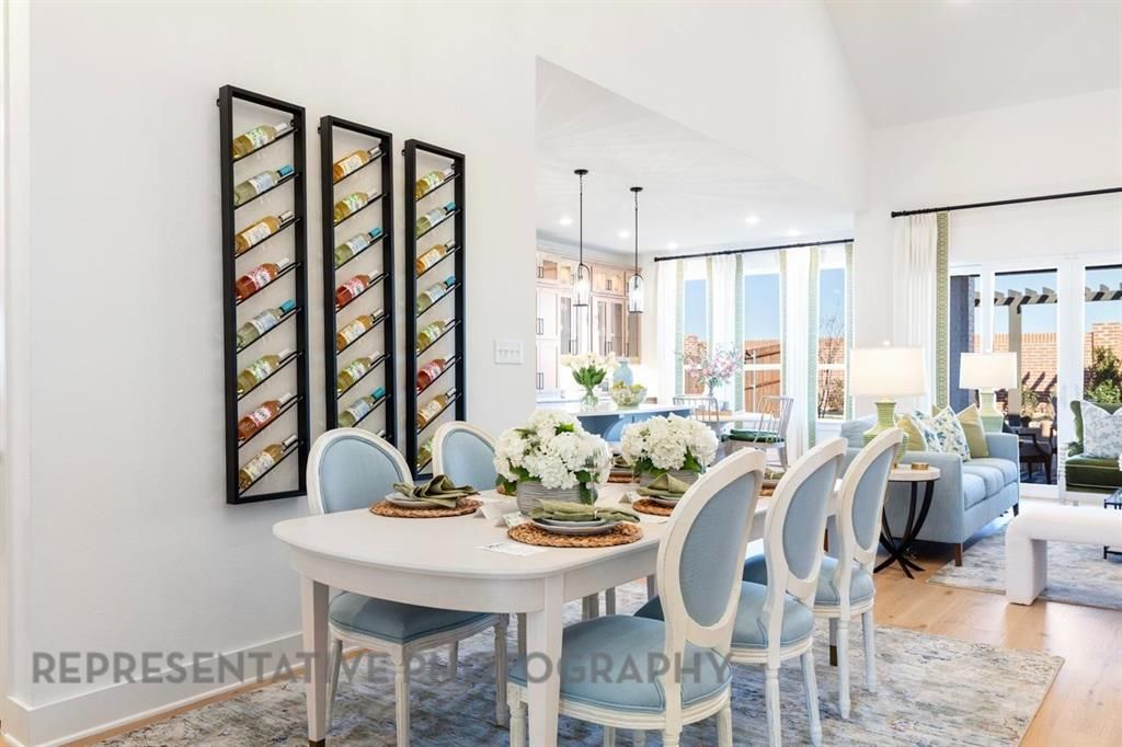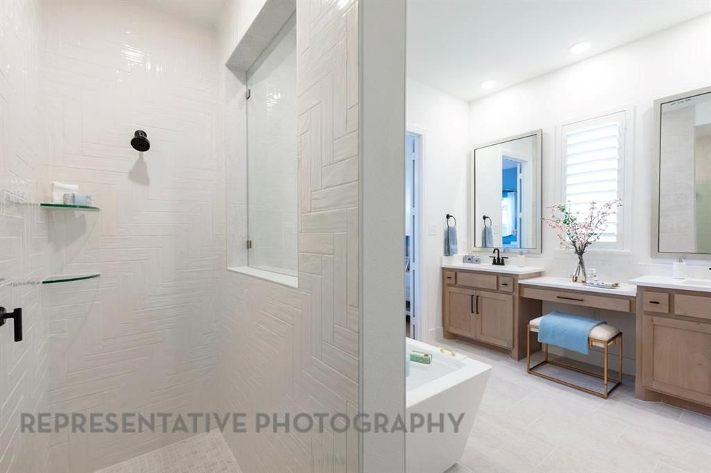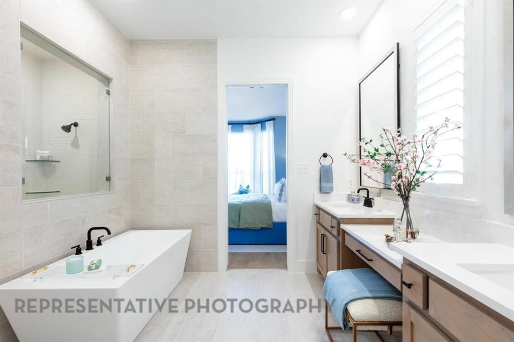 Gorgeous white brick home featuring an open concept floor plan, soaring ceilings, brick fireplace, and plenty of space for everyone! Kitchen includes designer tile backsplash, gas cooktop with separate oven and microwave, and an expansive quartz island. Enjoy entertaining on the extended covered patio! The primary suite showcases a bay window, separate shower with freestanding tub, dual sinks, and vanity.