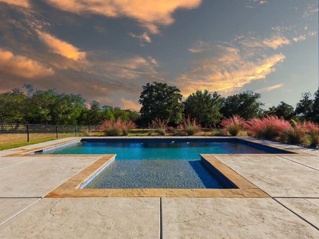 Perfectly situated on a corner 3 acre lot, this 2022 modern farmhouse blends modern luxury with the quiet beauty of country life. From sunrise to sunset, you'll enjoy open skies, peaceful surroundings, and a home designed to feel both stylish and welcoming. Inside, tall ceilings and natural light create an airy, open flow throughout. The living and dining spaces feature warm finishes and a beautiful stone fireplace that adds charm and character to the heart of the home. The kitchen ties it all together with a large island, clean lines, and thoughtful details"”perfect for everyday living or entertaining. The primary suite is a peaceful retreat with two walk-in closets and a spa-like bath complete with dual sinks, a soaking tub, and a separate shower. Each bedroom is generously sized and fitted with privacy blinds, giving every space its own sense of comfort and calm. Outdoors, the property truly shines. A custom pool with lounging area, outdoor kitchen, and a covered patio create the ideal setting for gatherings or quiet evenings under the Texas sky. The pipe fencing and lush landscaping frame the property beautifully while keeping it easy to maintain with an irrigation systems With solar panels, a private water well, water filtration system and propane, this home delivers both elegance and efficiency. Every detail has been designed to balance modern comfort with the serenity of country living"”a rare find where style and sustainability meet. Just 12 minutes from the historic Weatherford Square, enjoy the best of both worlds"”peaceful country living with quick access to local boutiques, restaurants, and small-town charm that make this area so special.