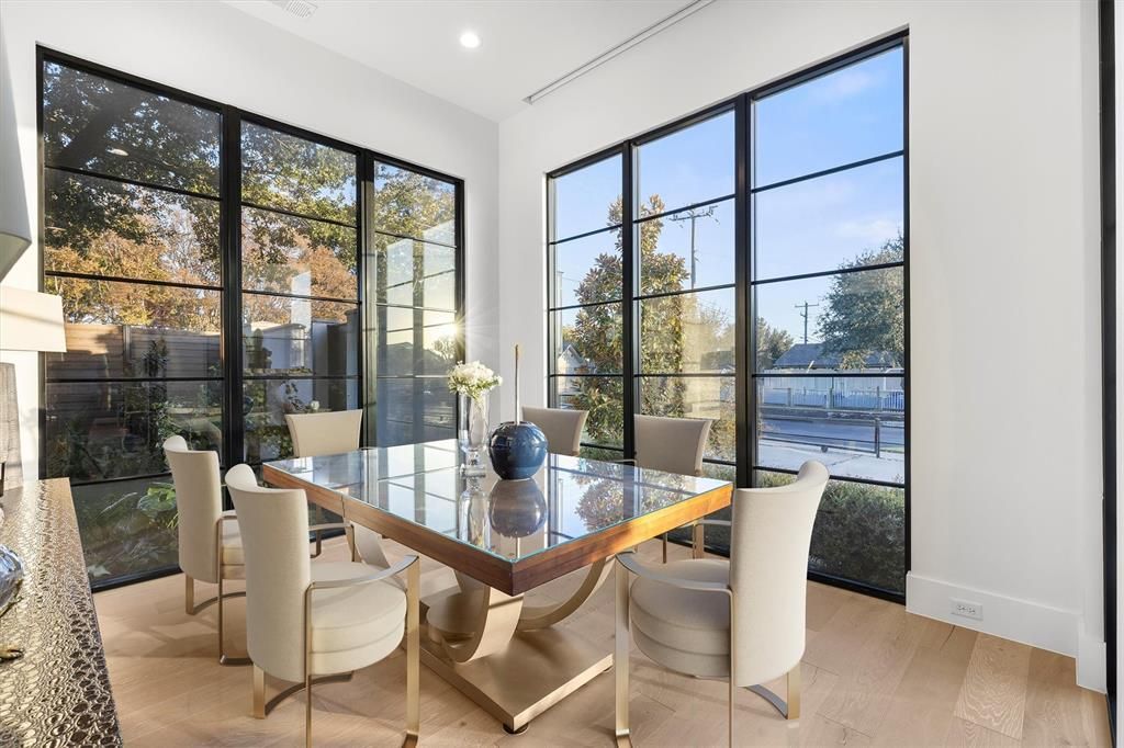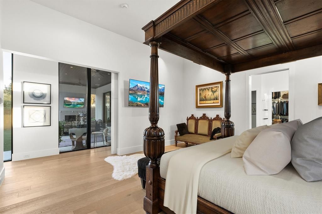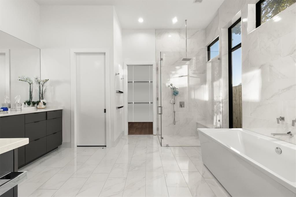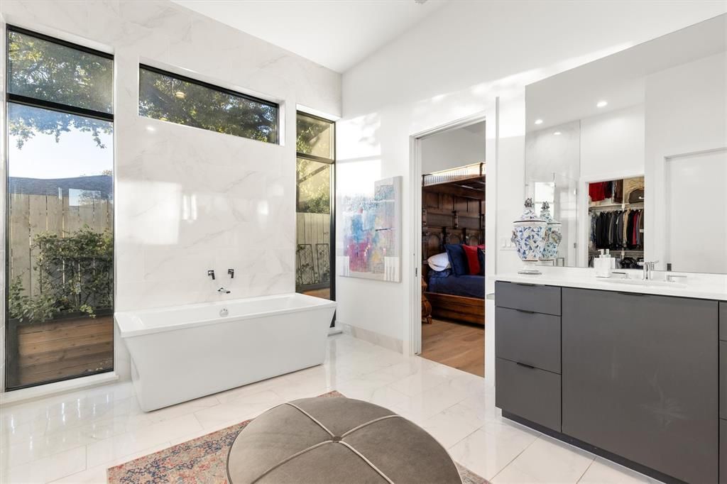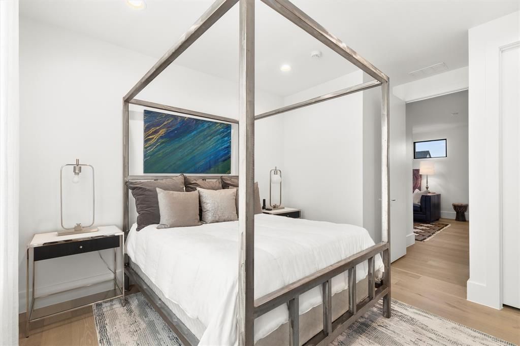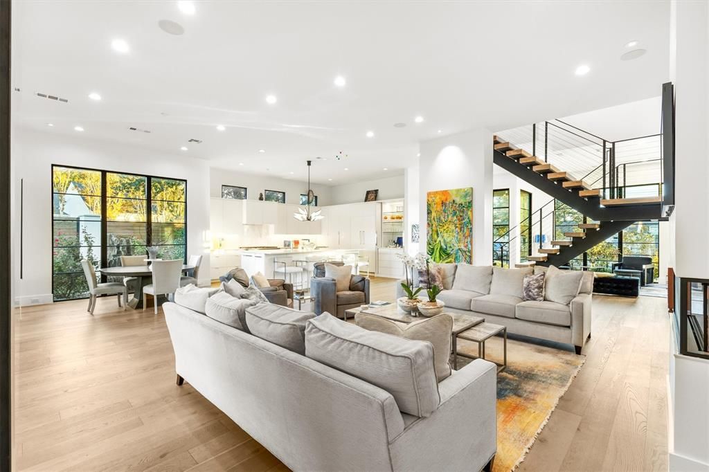 Available for short (monthly) or longterm leases. Offered furnished. Insurance relocations welcome. A luxury Midway Hollow two-story Transitional -Modern home with white Stucco on a corner large private fenced lot with clean lines, custom metal and glass windows and Entry doors allowing natural light throughout along with 7" white oak floors. Electric front shades allow for privacy. Open concept living with 12' ceilings, art gallery walls and lighting on the main floor along with extensive sound system. The main floor consist of the dining room, sitting room, study and bedroom, breakfast area, Living area with electric fireplace, and kitchen area. The kitchen area has a 12' island that seats 6, Corian countertops, custom cabinets with lots of storage, 6 burner gas stove, 48" column style fridge-freezer, 2 dishwashers, ice maker, 48" sink with 2 faucets. The 1st floor primary bedroom consists of a luxury bathroom, walk-in closet, with and outdoor shower in the private side yard. The utility and laundry room is adjacent to the primary bedroom which has a full size Frig, sink, and Dog door to the side yard. The seamless open living space is opened to a large covered veranda with a gas and wood burning fireplace by 16' sliding glass pocket doors allowing for a great indoor and outdoor living space for entertaining or life. The Turfed backyard is completed with a heated pool with fountains, a large petrified tree fountain and flower garden areas. A Floating staircase guides you upstairs to a Living area with 2 bedrooms and 2 bathrooms. A rear entry oversized garage is accessed with a large oversized electric gate. The home has extensive outdoor lighting, cameras, and security system
