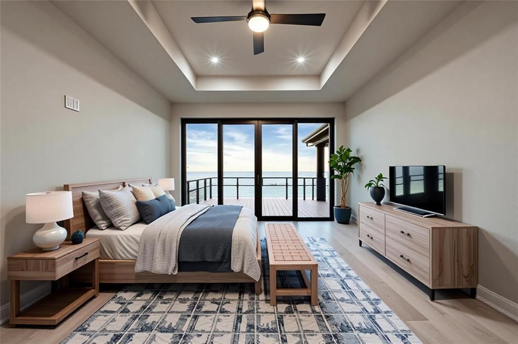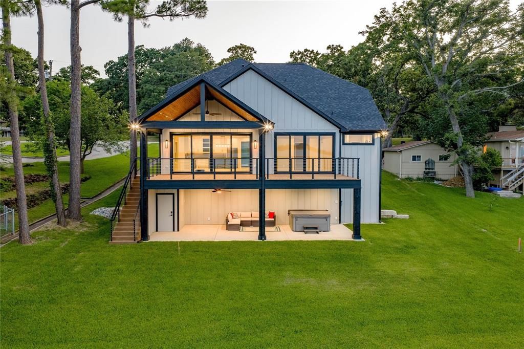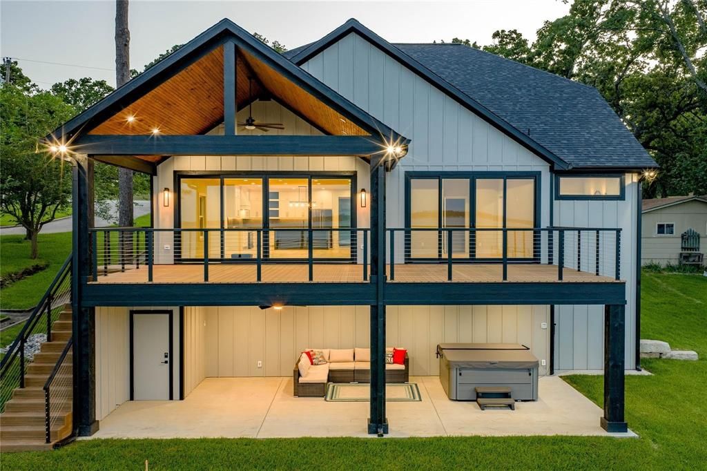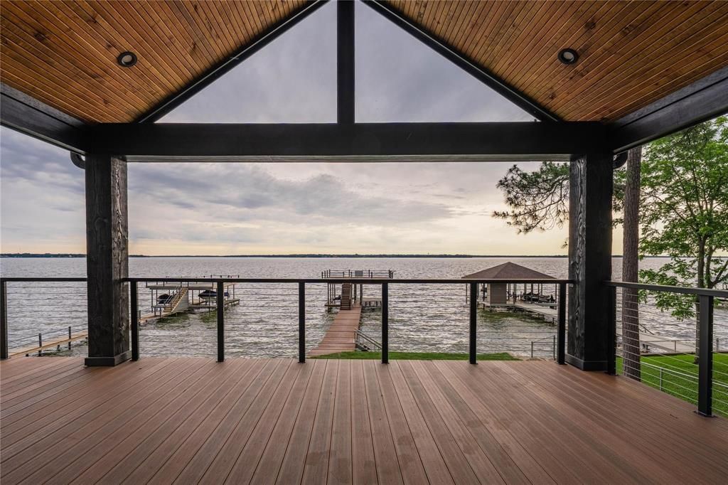 Experience lakeside living at its finest in this beautifully designed home that blends comfort, elegance, and effortless functionality. Wood flooring flows throughout the open living spaces, leading into a chef-inspired kitchen complete with gas cooking, quartz countertops, a large island bar, an ice maker, and a fully equipped butler's pantry with a sink, and microwave. The primary suite offers a true retreat with glass doors opening directly onto the lakeside deck, while the spa-style bath features a soaking tub, rain head, and body sprayer for a luxurious escape. With three spacious bedrooms, two guest suites with double vanities, and a bunk room, the home easily accommodates families, groups, or long-term tenants. Indoor-outdoor living shines with a covered porch, open deck, and a lower-level patio with a hot tub overlooking wide-open water. A double boathouse with an upper deck sits on deep water, providing convenience and stunning views. This property is ideal for short-term stays, extended rentals, or full-time living, offering a rare combination of luxury, flexibility, and lakeside charm.