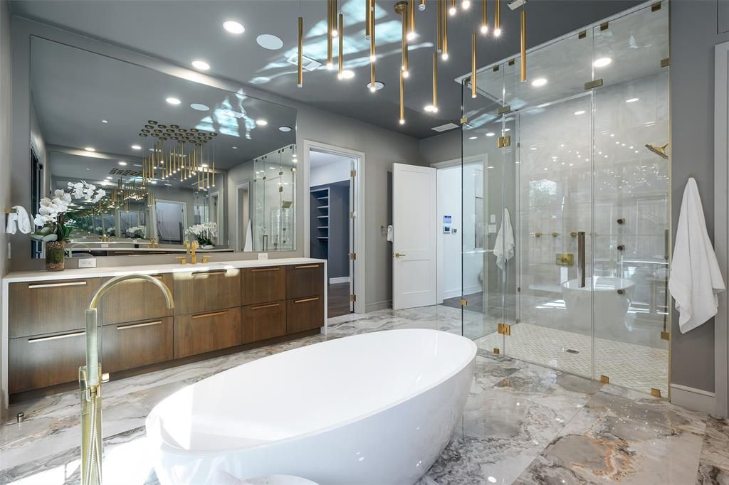 Beautifully expanded and reimagined this exceptional estate is located in the sought-after Strait Lane corridor of Preston Hollow. Set on 1.2 acres of lush, gated grounds, the property offers privacy and security. The main residence is ideal for both entertaining and everyday living, with interiors filled with natural light, expansive walls, and high ceilings. The first floor includes a grand foyer, formal living and dining rooms with a temperature-controlled wine room, media room, and family room that also lives as a lounge. The gourmet kitchen is complemented by a secondary catering kitchen, butlers pantry, and walk-in pantry. The dual-level primary suite includes a private outdoor spa. Four additional bedrooms are located upstairs, along with flexible accommodations and additional entertaining space. A 2, 300 sq ft architecturally significant pool house features vaulted ceilings, living and dining areas, two bedrooms, and two bathrooms. A covered terrace provides expansive outdoor living with views of the 22' pool, sports court with pickleball and basketball, putting green, and manicured lawns. Situated at the end of Lennox Lane, the home offers a dramatic approach and convenient access to top Dallas schools, shopping, and dining.