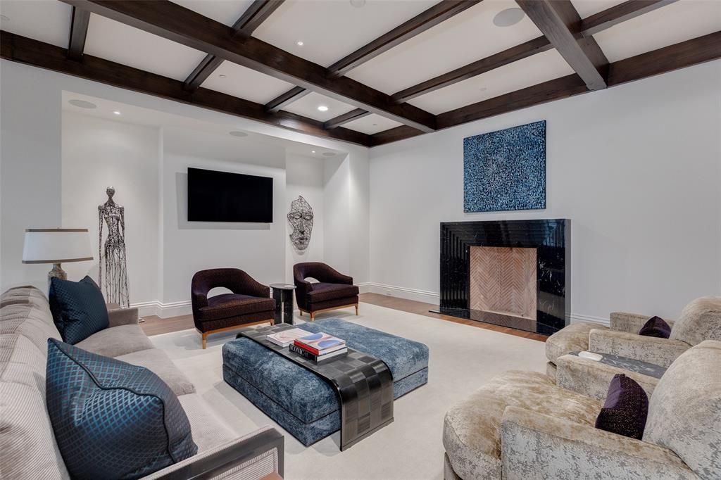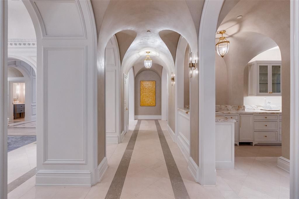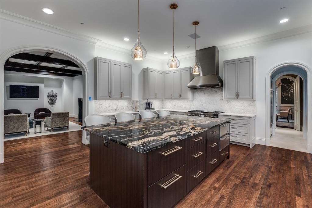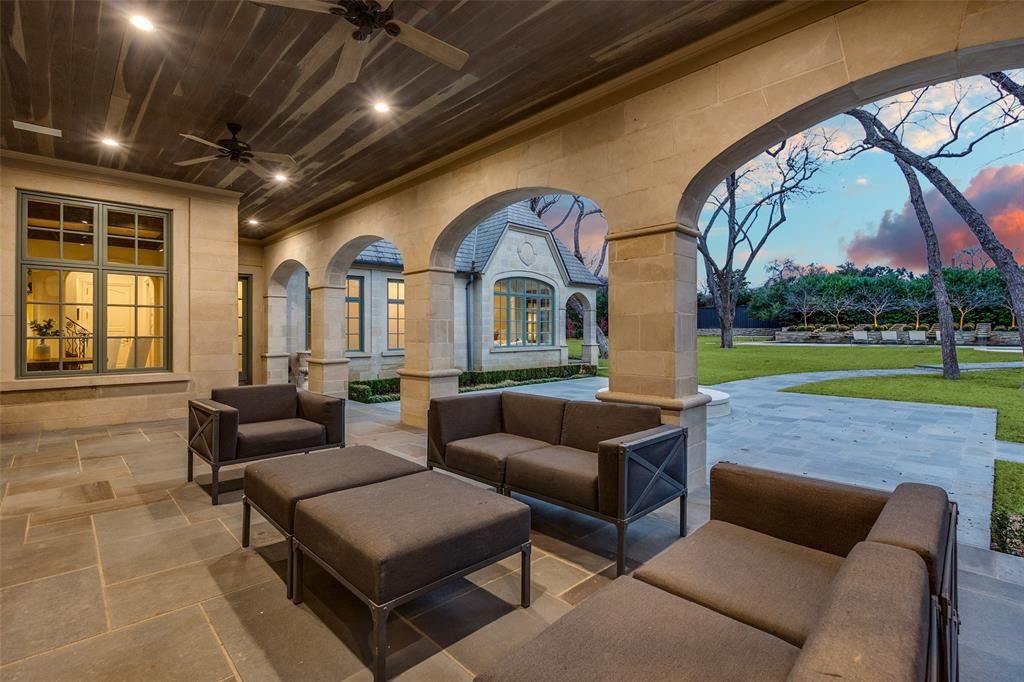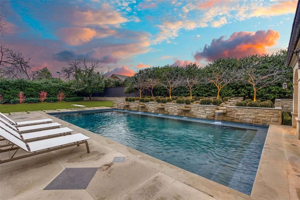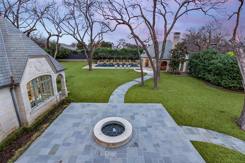 This Private French Estate with tennis court is nestled behind secure gates on two beautifully landscaped acres, offering timeless architecture, extraordinary privacy, & extensive recent upgrades. Built by Cy Barcus and designed by renowned architect Wilson Fuqua, the 11,056-square-foot residence showcases impeccable craftsmanship, grand scale, & sophisticated living. A dramatic foyer with a sweeping staircase opens to elegant formal living & dining spaces, refined archways, & a gracious family room featuring a fireplace, bar, & wine cellar. The fully renovated gourmet kitchen is equipped with new custom cabinetry, countertops, Wolf & Sub-Zero appliances, oversized island, double ovens, built-in refrigeration, & a butler's pantry. The oversized primary suite is secluded on the main level & includes a sitting area with blackout shades, fireplace, expansive his-and-hers closets, & a completely remodeled spa bath with designer finishes. Upstairs offers four spacious ensuite bedrooms plus a large game room & kitchen. Designed for effortless entertaining, the home features exceptional indoor-outdoor flow to a resort-style backyard with pool, outdoor kitchen, covered living areas, cabana, & tennis court. Extensive Improvements & Features Include: RTI smart home system; Lutron lighting; designer tile by Ann Sacks, Walker Zanger, & Artistic Tile; updated bar, family room, study, dining room (with hand-painted Allan Knight wallpaper); new mini kitchen upstairs; new water filtration system, thermostats, sewer line, chimney cap; three-car garage with EV charging in each bay; Complete wood, iron, & chain-link perimeter fencing for maximum security; Expanded drive & improved motor court & porte cochère; Renovated fountain with bluestone surround & new pool walkway, & MORE! A rare opportunity to own an updated, architecturally significant estate offering privacy, scale, & luxury amenities in a premier Dallas location. Conveniently located near the private school corridor!