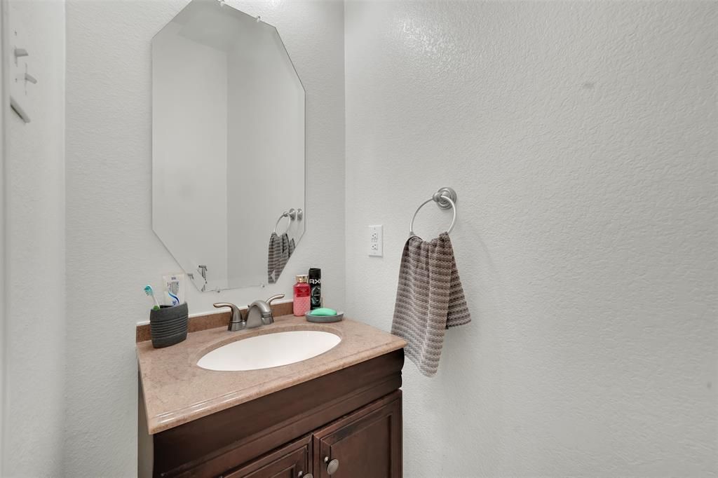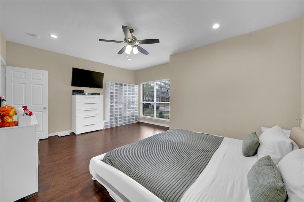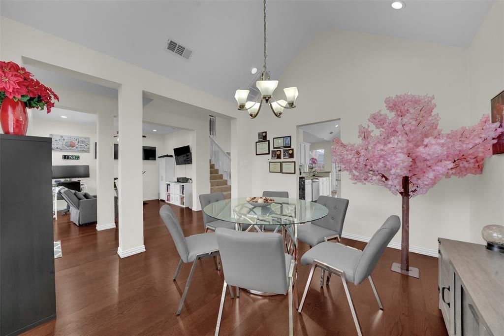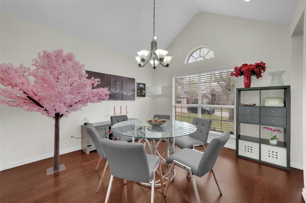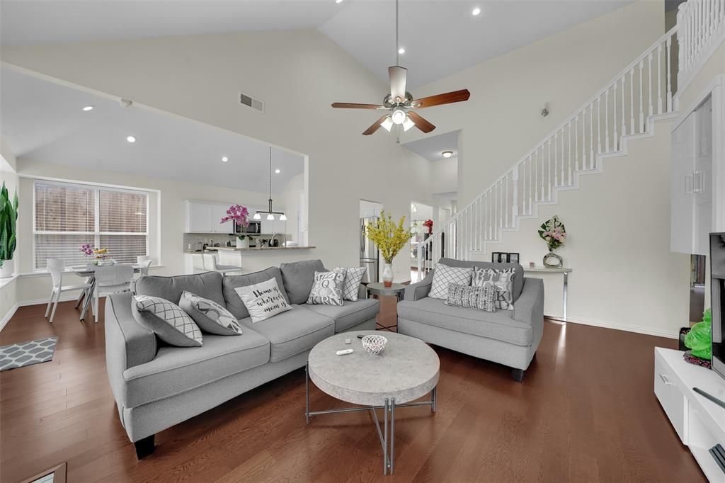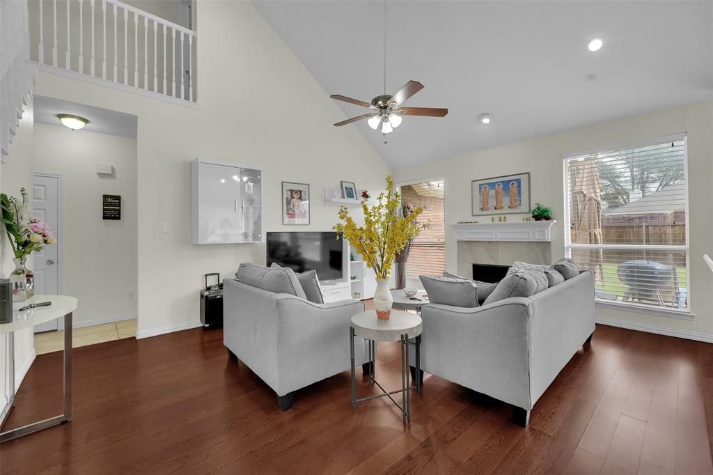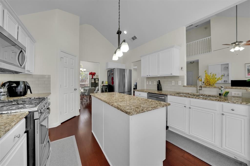 Well-maintained 4-bedroom, 2.5-bath home in Frisco with a layout that truly works. The home features soaring ceilings, wood flooring, and an open living area filled with natural light. The updated kitchen offers granite countertops, white cabinetry, stainless steel appliances, and a large island that opens seamlessly to the main living space. The downstairs primary suite is spacious and includes dual closets and a beautifully updated bath with a freestanding tub, walk-in shower, and double vanities. Upstairs you'll find three generously sized bedrooms, a remodeled secondary bath, and flexible space for a game room or office. Private backyard ready for your personal touch. Conveniently located near highly rated Frisco Independent School District schools with easy access to the Dallas North Tollway, plus shopping and dining just minutes away.