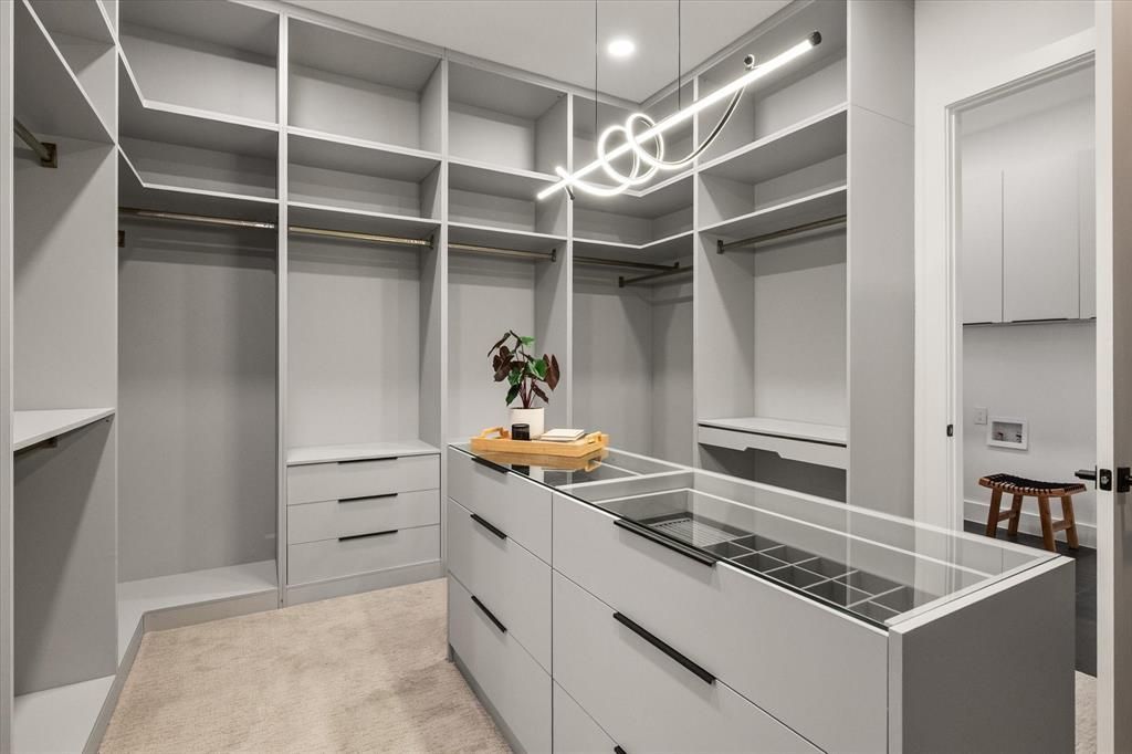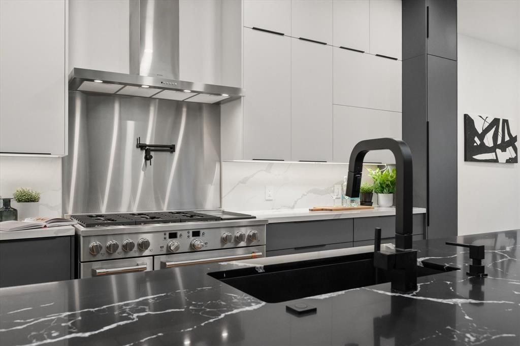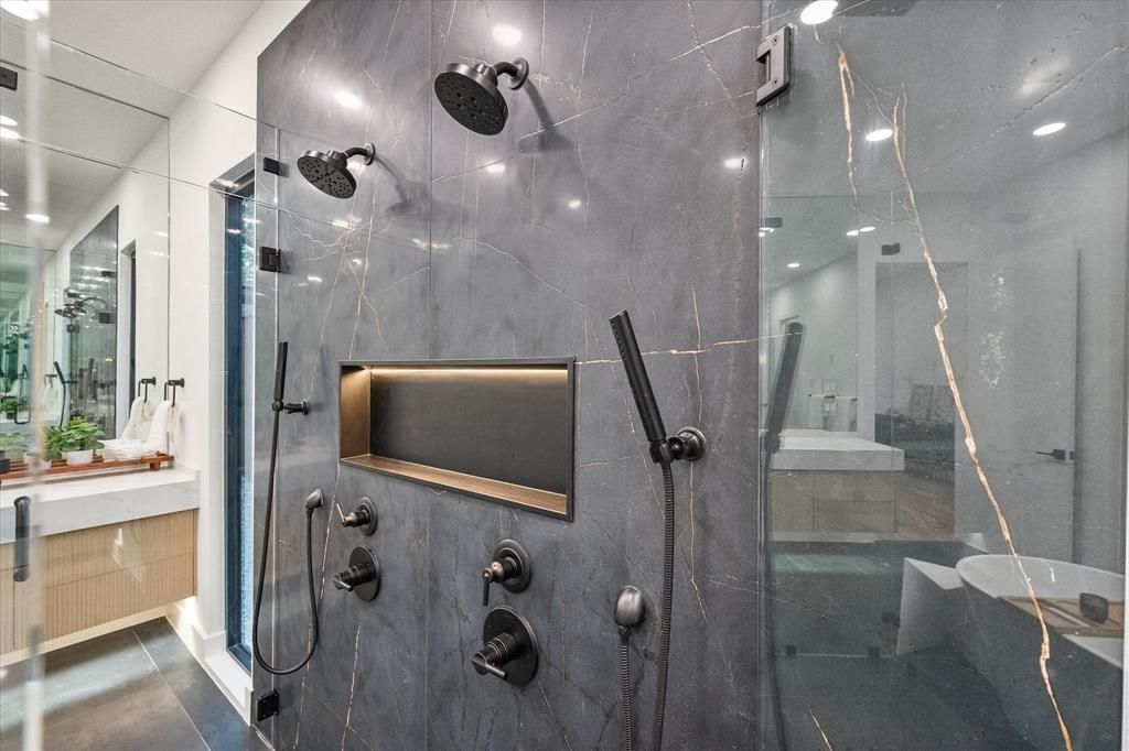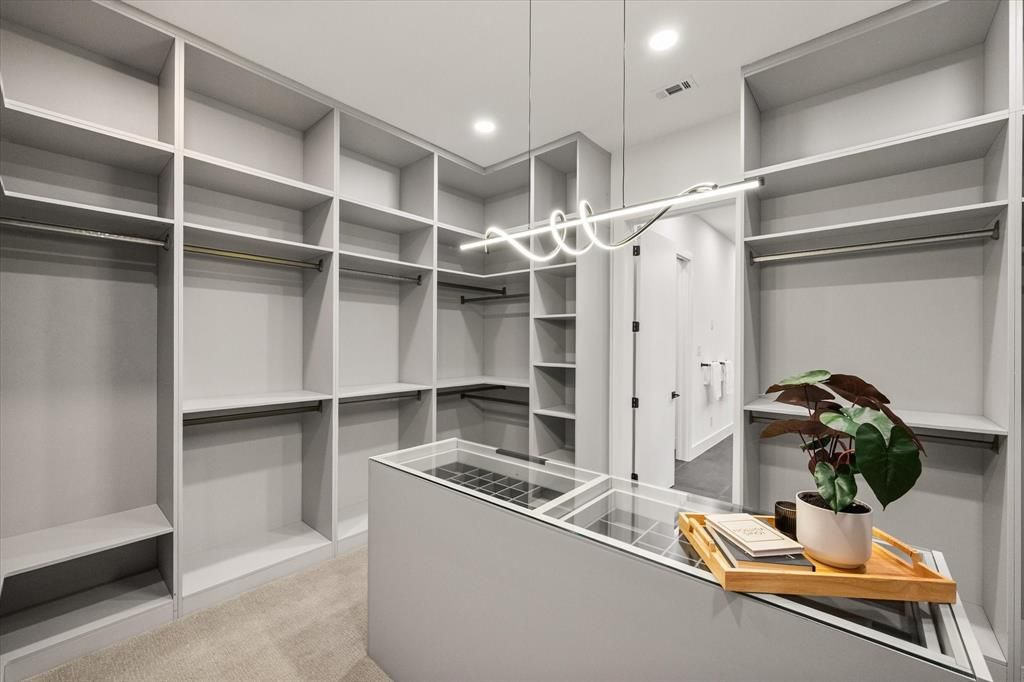 Exquisite modern contemporary home in sought-after Midway Hollow, 3739 Rockdale Drive offers 4,006 square feet of cutting-edge design and refined living. Soaring 20+ foot vaulted ceilings and White Oak hardwood floors set the tone for the open-concept layout, centered around a dramatic gas fireplace. The chef-inspired kitchen is a true showpiece with quartz countertops, an oversized island, 48-inch range, pot filler, microwave drawer, wine cooler, custom cabinetry, walk-in pantry, and a connected utility-butler's pantry with additional counter space, sink, and storage. The main level boasts a luxurious owner's suite with a spa-like bath featuring a freestanding tub, dual shower with rainfall head, 2 floating vanities with ambient under cabinet lighting, and an expansive walk-in closet with center island, plus a guest suite that can be used as office and powder room. Upstairs, three bedrooms with en-suite access complement a versatile open living room with sliding doors to a covered balcony overlooking the backyard. Smart technology, designer lighting, a tankless water heater, and energy-efficient spray foam insulation complete this exceptional home, where every detail has been thoughtfully crafted for modern luxury.