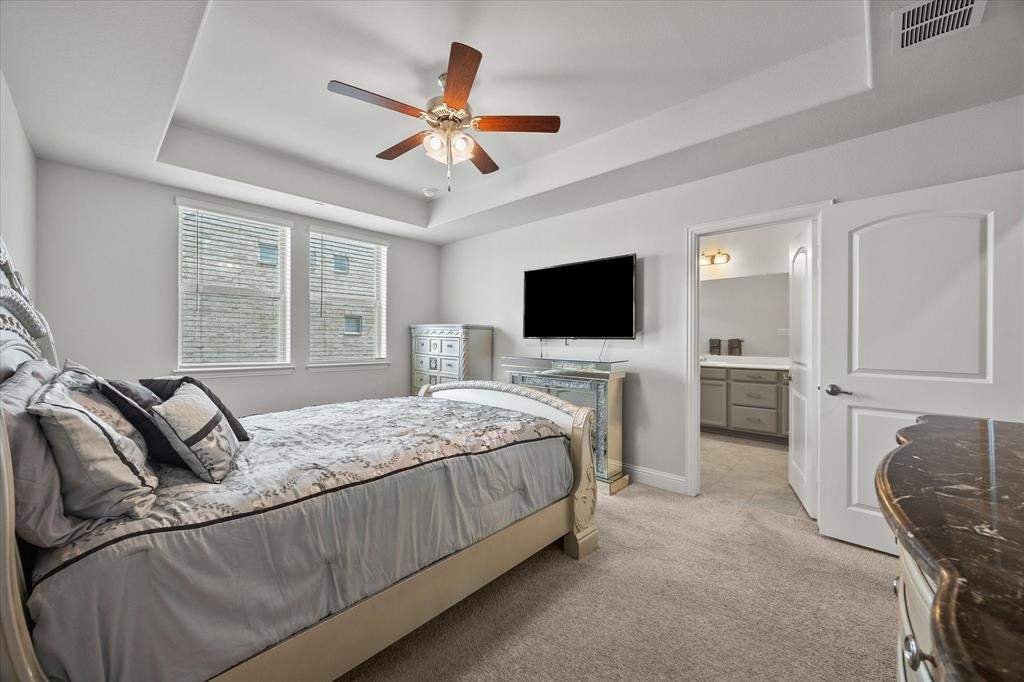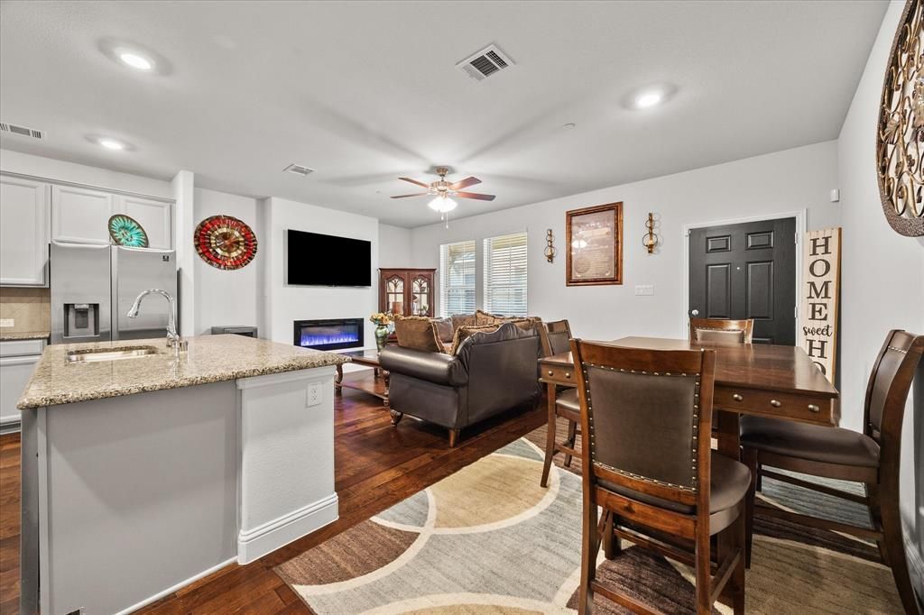 Prime location near Methodist Richardson Medical Center and President George Bush Turn Pike. I invite you to come see this beautiful, like-new townhouse. The property features an open floor plan living area complete with wood floors and a decorative, remote-controlled gas fireplace. The galley-style kitchen is finished with granite countertops, a ceramic tile backsplash, and gray cabinetry. It comes equipped with new stainless steel appliances, including a built-in gas cooktop and an exterior-vented hood. The primary bedroom includes an ensuite bath with a dual granite vanity and a large walk-in shower with a bench seat. Two additional bedrooms are located on the second floor, while a fourth bedroom on the third floor also includes an ensuite bathroom. For hosting movie or game nights, the home offers a cozy patio balcony. Don't wait to schedule a viewing.