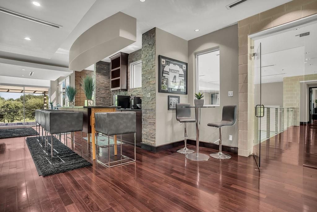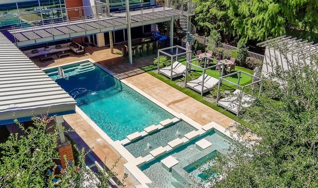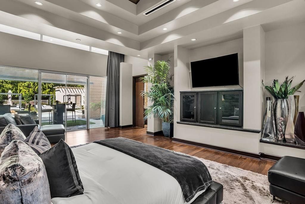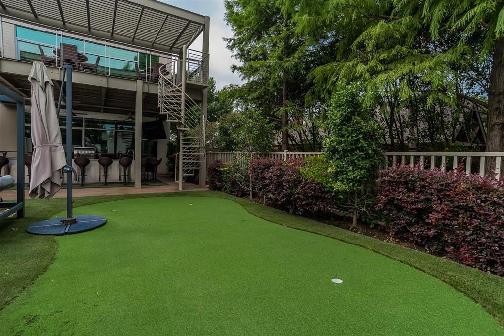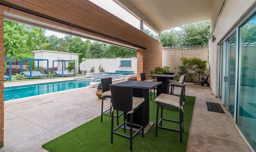 This stunning contemporary home sits gracefully on a prominent corner lot, offering a striking modern design that thoughtfully separates everyday living from entertainment. Bedrooms are tucked privately on one side of the home, while the chef-inspired kitchen and expansive living areas flow together on the other. The kitchen showcases elegant pendant lighting, Viking appliances, and clear views of the backyard oasis. Warm interior tones, recessed lighting, tall ceilings, and floor-to-ceiling windows in the living room create a bright, inviting atmosphere, enhanced by a large built-in aquarium perfect for Nemo and all his fish friends. The living room's breathtaking window wall frames spectacular views of the resort-style pool, which can also be enjoyed from the kitchen, dining room, primary suite, and the dramatic catwalk balcony. The second floor is an entertainer's dream, ideal for sports lovers and movie enthusiasts alike. It features a true movie-style media room, a spacious gameroom, and a large wet bar with an elongated serving counter"”perfect for hosting game nights, watch parties, or relaxed gatherings. From this upper level, guests enjoy direct access to the balcony overlooking the resort pool, creating a seamless indoor-outdoor experience. Outside, the home transforms into a private paradise with an outdoor kitchen, sparkling pool with a waterfall and hot tub, relaxing cabanas, a putting green, and a spiral staircase leading effortlessly to the upstairs balcony. The primary bedroom offers a luxurious retreat with a tray ceiling, cozy fireplace, walk-in closet, private patio, and tranquil pool views, while additional bedrooms provide generous space, walk-in closets, and ensuite bathrooms. Completing this exceptional property is a spacious 4-car garage with ample room for vehicles, tools, and storage"”making this modern masterpiece as functional as it is beautiful.