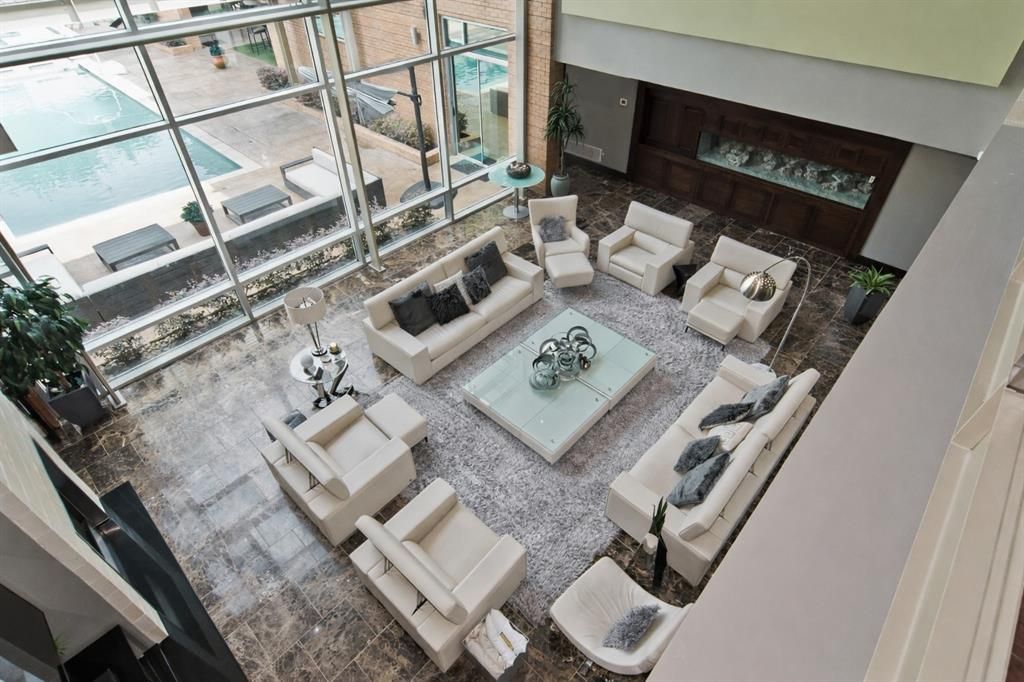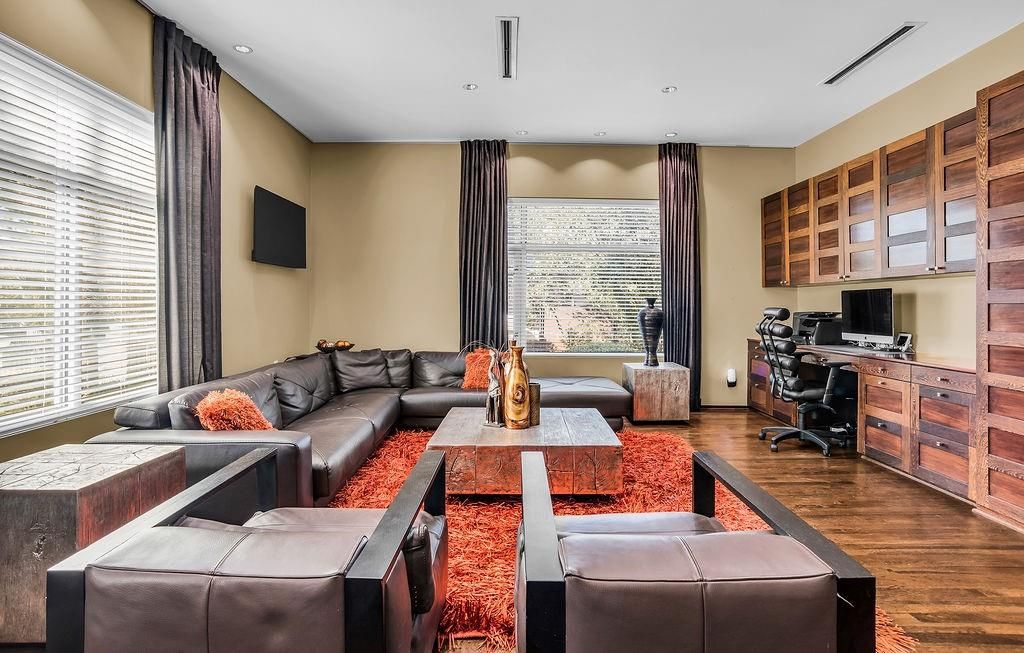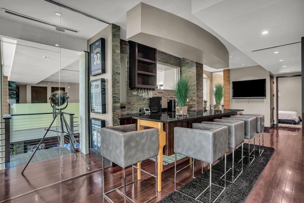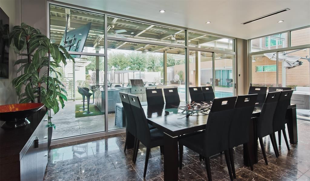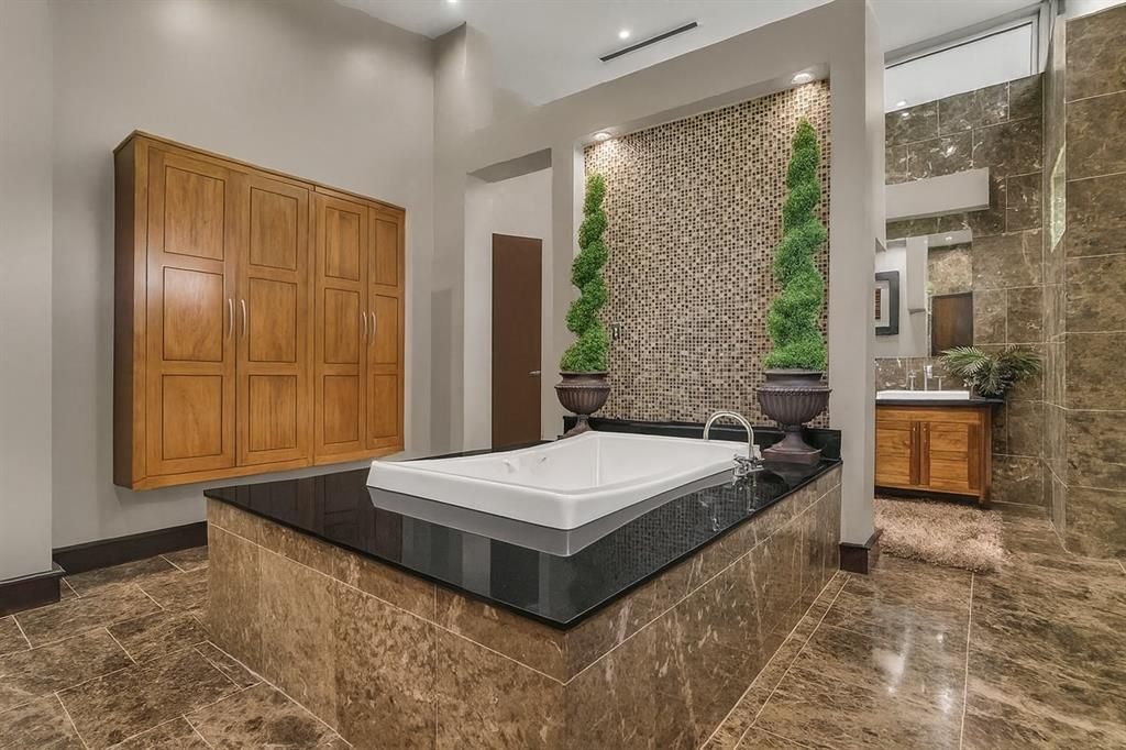 This stunning contemporary home sits gracefully on a prominent corner lot, offering a striking modern design that thoughtfully separates everyday living from entertainment. Bedrooms are tucked privately on one side of the home, while the chef-inspired kitchen and expansive living areas flow together on the other. The kitchen showcases elegant pendant lighting, Viking appliances, and clear views of the backyard oasis. Warm interior tones, recessed lighting, tall ceilings, and floor-to-ceiling windows in the living room create a bright, inviting atmosphere, enhanced by a large built-in aquarium perfect for Nemo and all his fish friends. The living room's breathtaking window wall frames spectacular views of the resort-style pool, which can also be enjoyed from the kitchen, dining room, primary suite, and the dramatic catwalk balcony. The second floor is an entertainer's dream, ideal for sports lovers and movie enthusiasts alike. It features a true movie-style media room, a spacious gameroom, and a large wet bar with an elongated serving counter"”perfect for hosting game nights, watch parties, or relaxed gatherings. From this upper level, guests enjoy direct access to the balcony overlooking the resort pool, creating a seamless indoor-outdoor experience. Outside, the home transforms into a private paradise with an outdoor kitchen, sparkling pool with a waterfall and hot tub, relaxing cabanas, a putting green, and a spiral staircase leading effortlessly to the upstairs balcony. The primary bedroom offers a luxurious retreat with a tray ceiling, cozy fireplace, walk-in closet, private patio, and tranquil pool views, while additional bedrooms provide generous space, walk-in closets, and ensuite bathrooms. Completing this exceptional property is a spacious 4-car garage with ample room for vehicles, tools, and storage"”making this modern masterpiece as functional as it is beautiful.