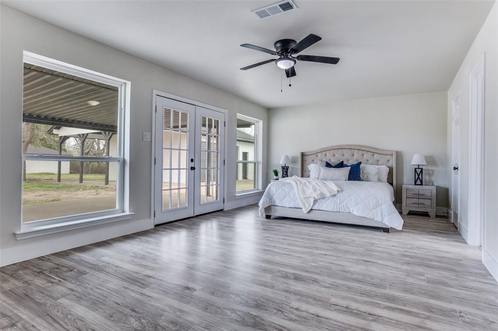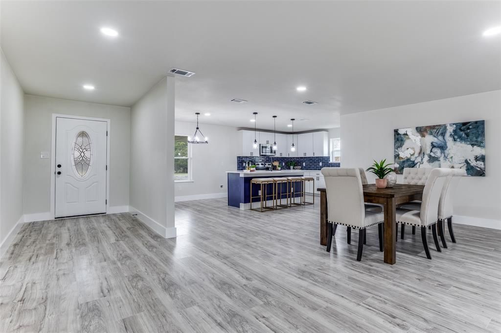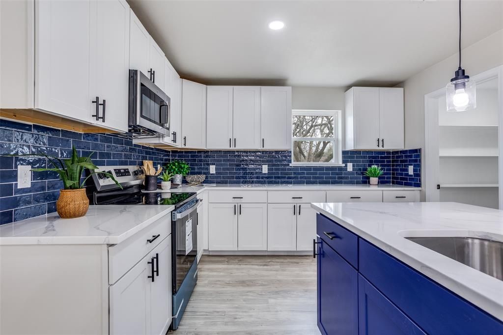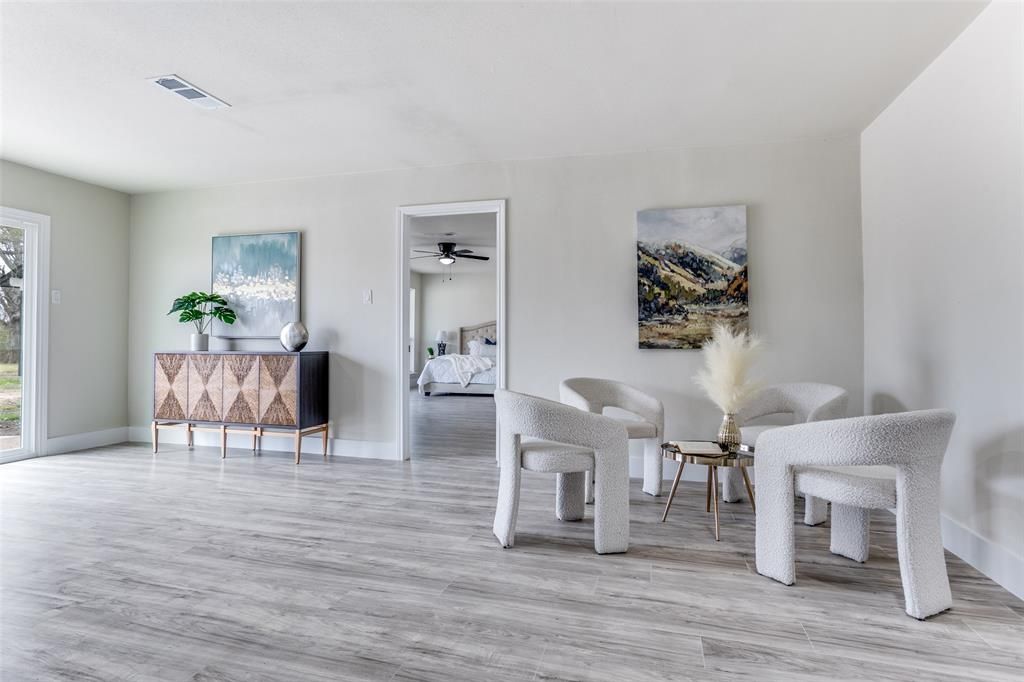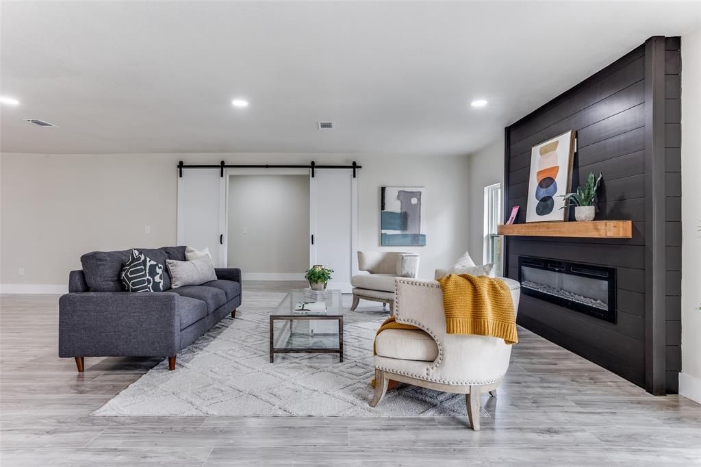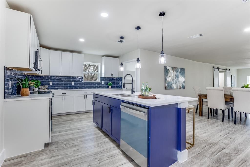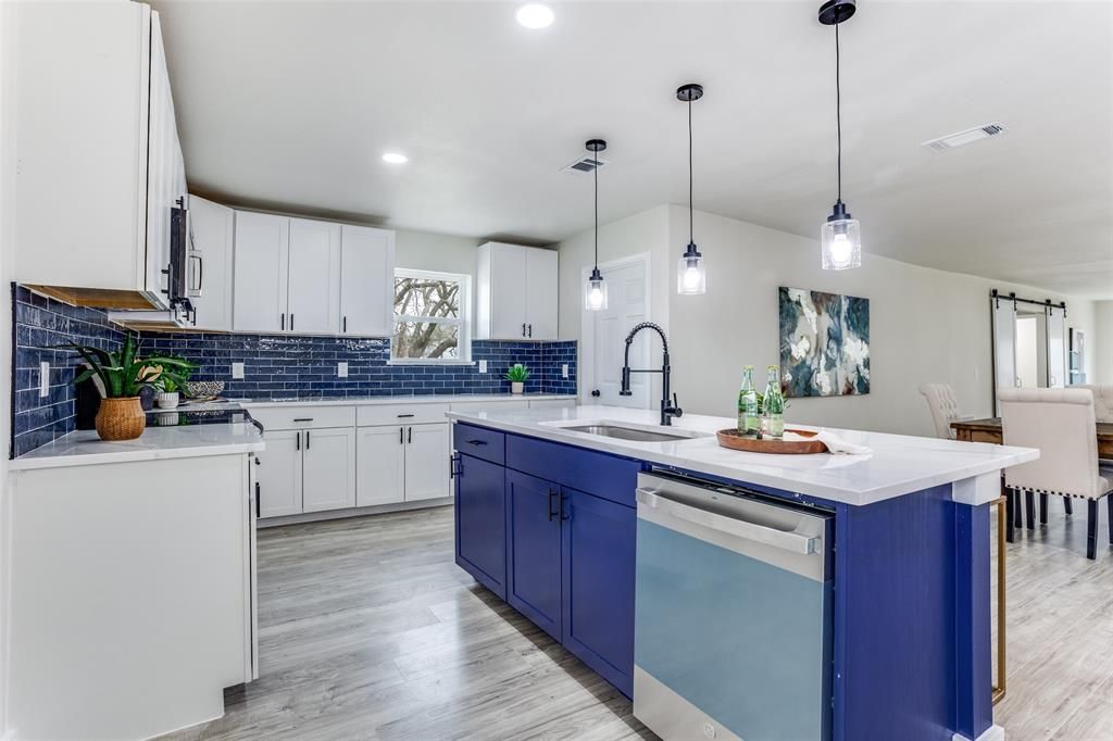 Stunning fully renovated ranch-style home set on almost an acre, surrounded by mature trees and offering both privacy and modern elegance. The open-concept living space is filled with natural light and anchored by a striking contemporary fireplace, creating a warm and inviting atmosphere. The designer kitchen features quartz countertops, white shaker cabinetry, stainless steel appliances, a bold navy island, and a sleek tile backsplash that adds a sophisticated touch. The oversized primary suite offers a peaceful retreat with patio access and a spa-inspired bathroom complete with a spacious walk-in shower and modern finishes. Step outside to enjoy the covered patio and expansive backyard, perfect for entertaining or relaxing. The property also features a detached garage and additional covered structure, providing plenty of space for parking, storage, a workshop, or hobbies. Offering modern upgrades, generous outdoor space, and the feel of country living with city convenience, this home is a rare find. Buyer incentive available. Buyers who choose the seller's preferred lender may receive a lender credit toward closing costs. Contact listing agent for details.